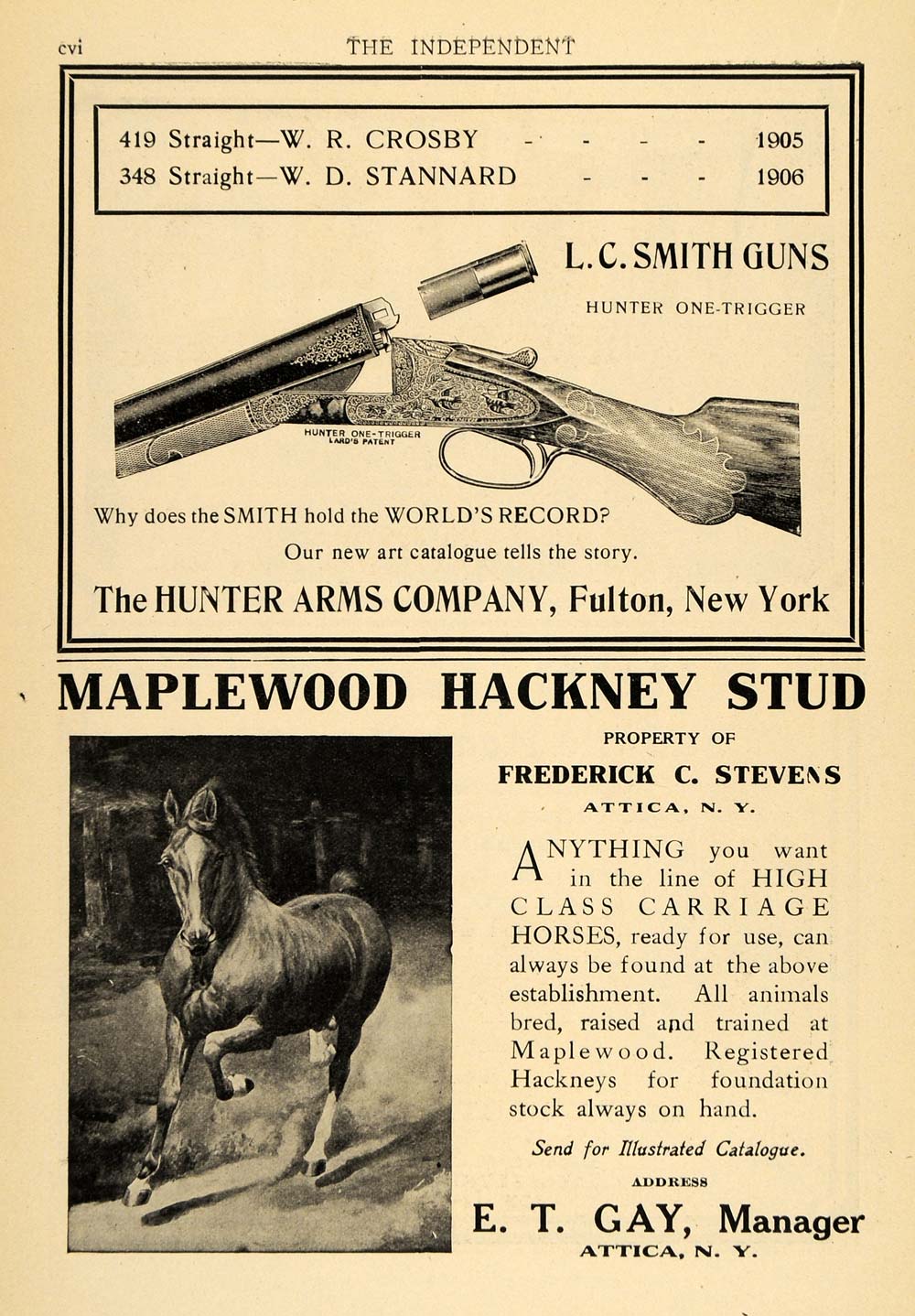 This ad also features the Maplewood Hackney Stud promoting the line of High Class Carriage Horses. Information available from E. T. Gay, Manager and Frederick C. Stevens, Proprietor, Attica, New York.