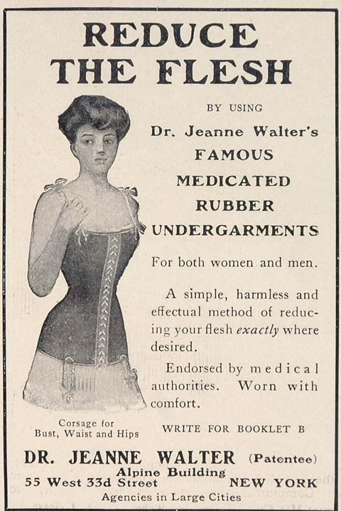 This is an original 1907 black and white print ad for Dr. Jeanne Walter's famous medicated rubber undergarments. Information from Dr. Jeanne Walter, Alpine Building, 55 West 33rd Street, New York City.