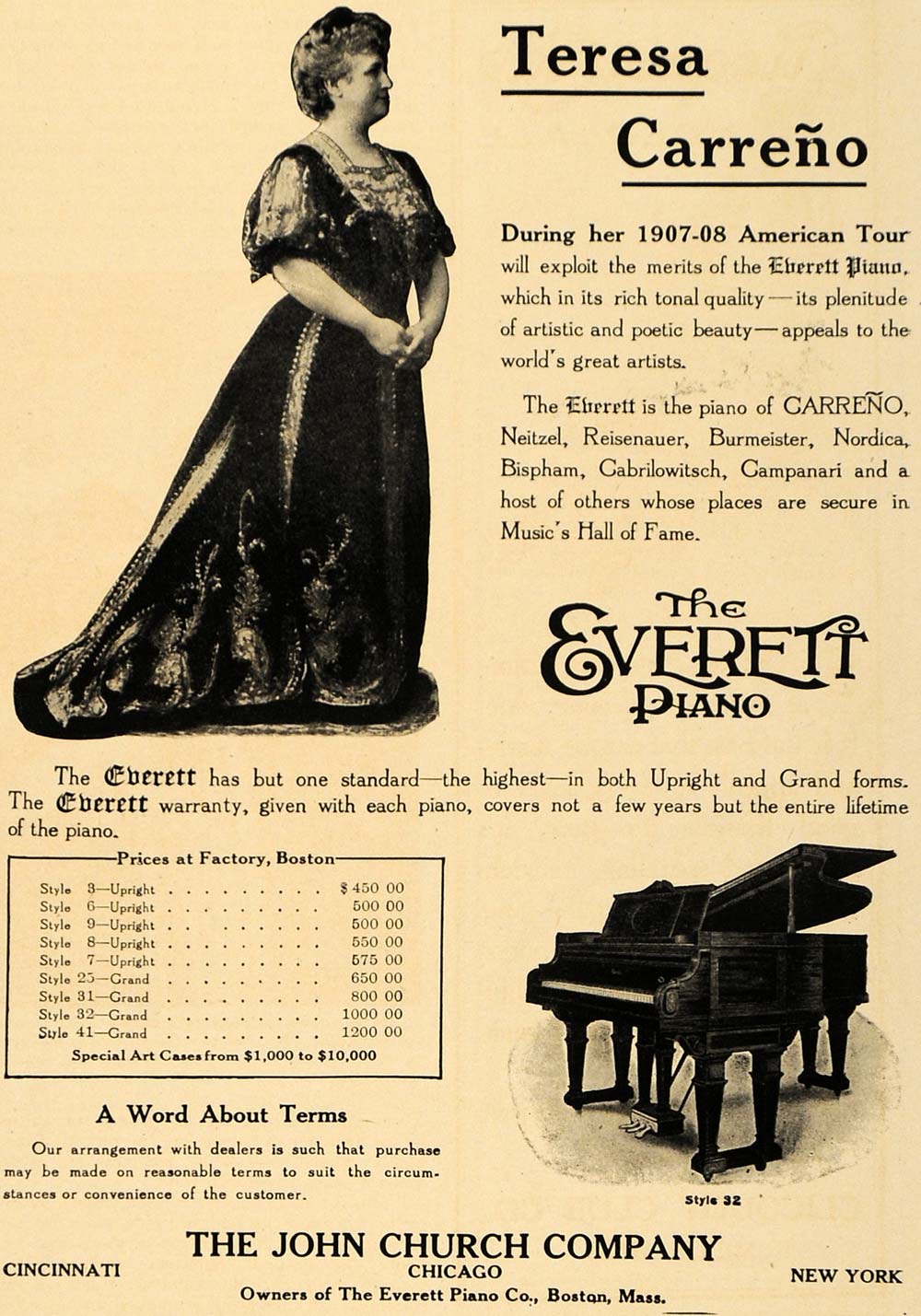 This is an original 1907 black and white print ad for the Everett Piano from John Church Company located in Chicago, Illinois. This ad features the Venezuelan pianist and singer Maria Teresa Carre–o Garc’a de Sena.