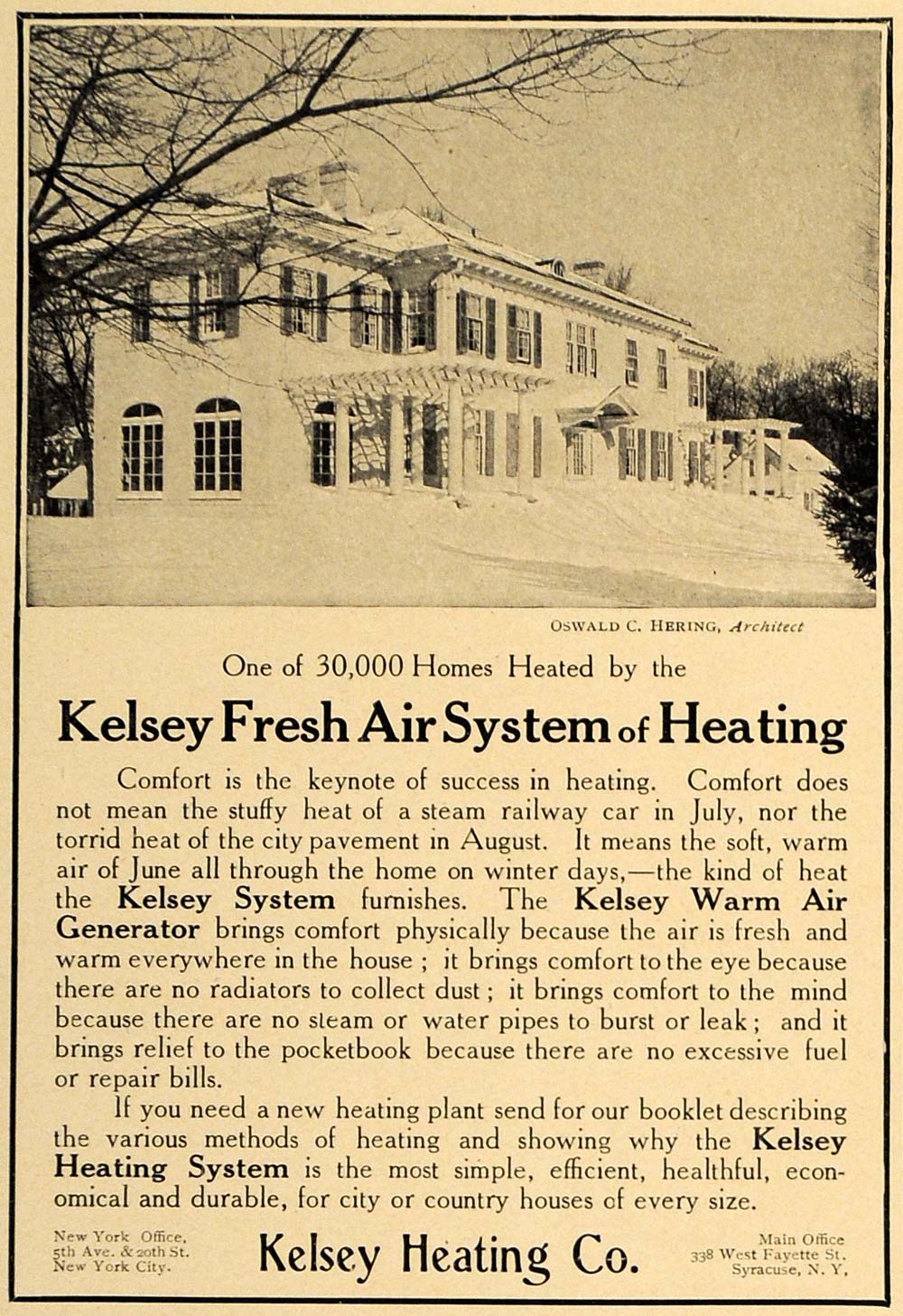 This is an original 1907 black and white print ad for Kelsey Fresh Air System of Heating and Warm Air Generator, featuring a Kelsey client home with architecture by Oswald C. Hering.