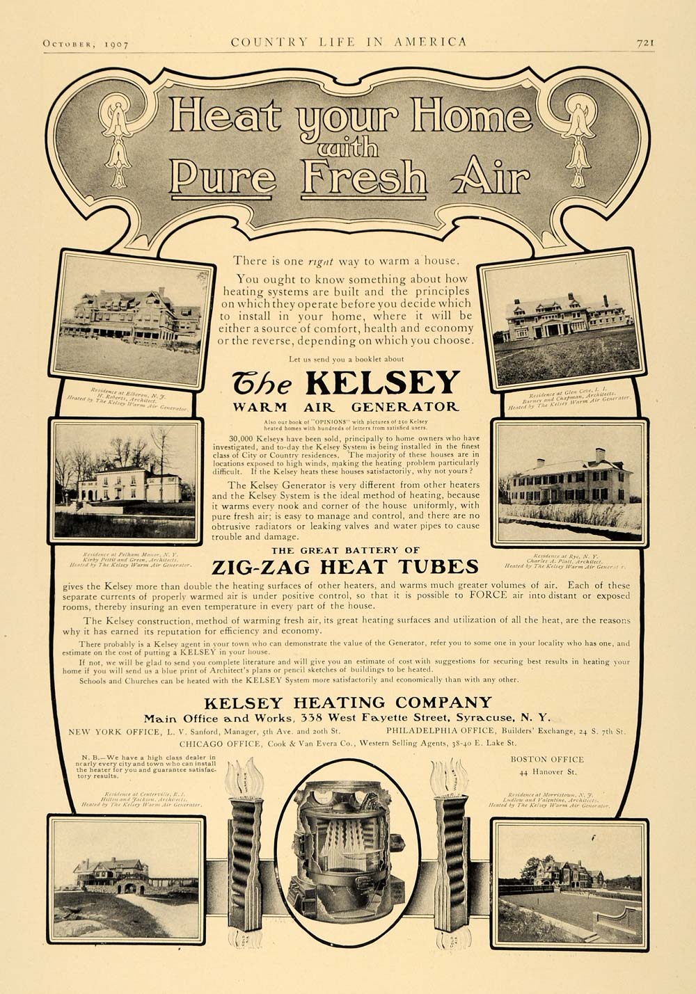 This is an original 1907 black and white print ad for the Kelsey Heating Company's The Kelsey Warm Air Generator and the great battery of Zig-Zag Heat Tubes.
