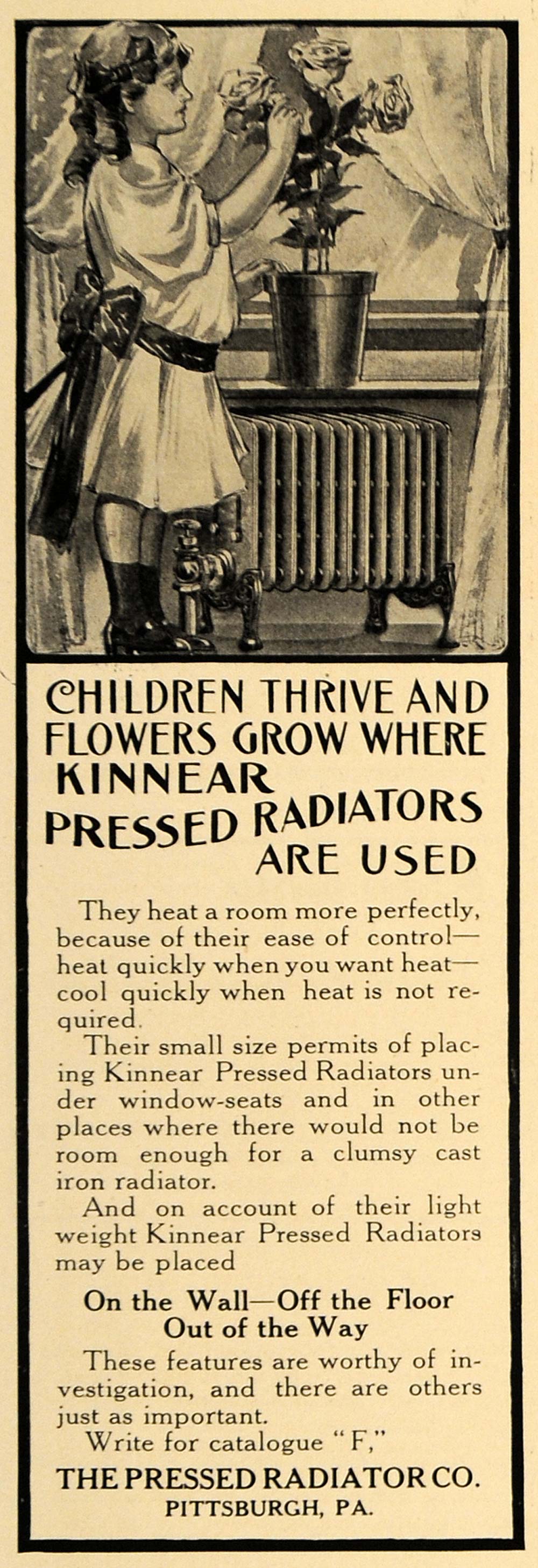 This is an original 1907 black and white print ad for the Kinnear Pressed Radiator from Pressed Radiator Company located in Pittsburgh, Pennsylvania.