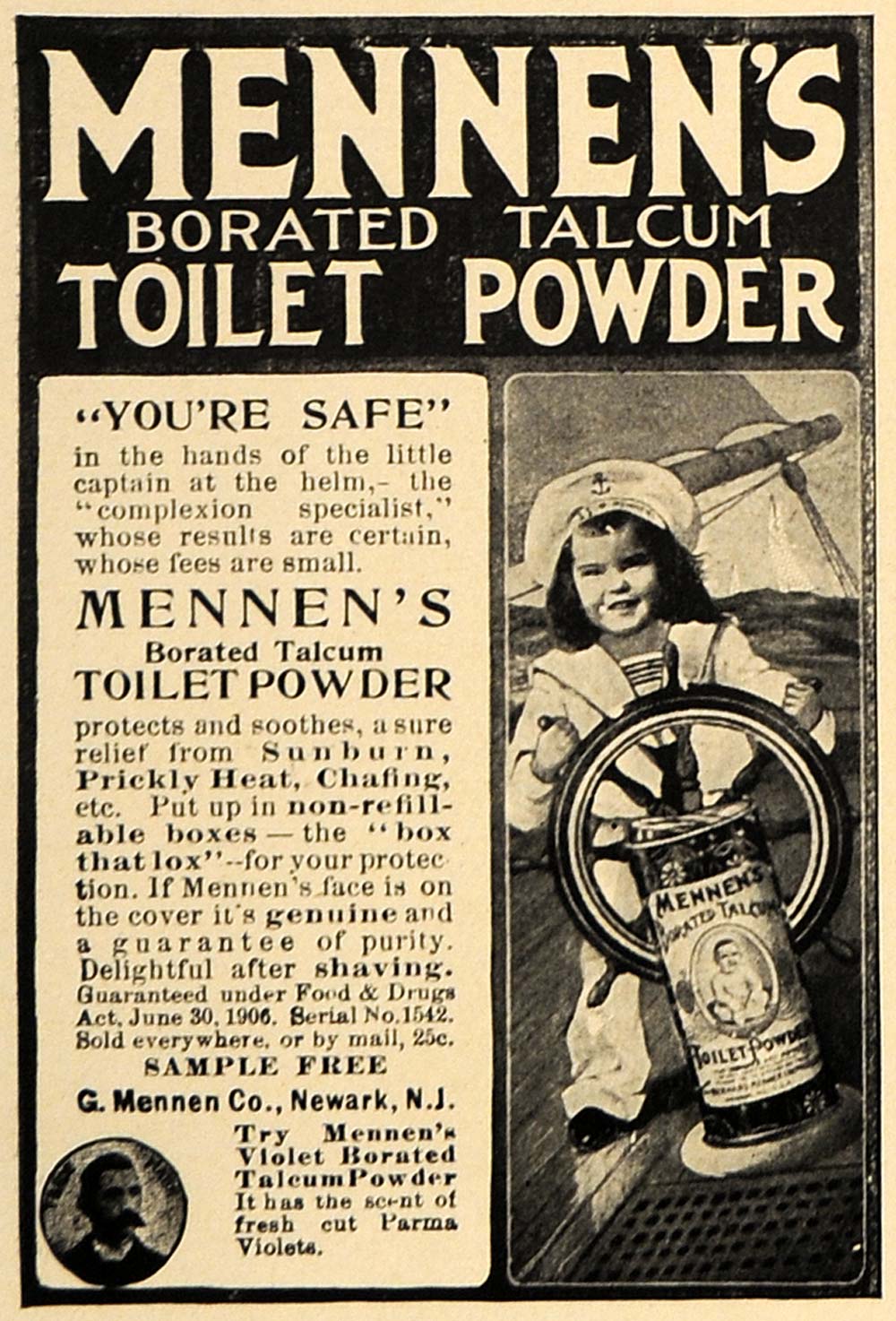 This is an original 1907 black and white print ad for Gerhard Mennen's Borated Talcum Toilet Powder.