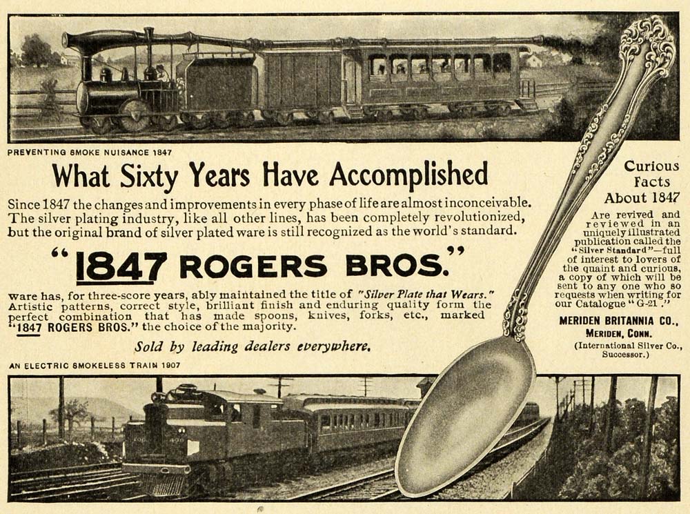 In 1862, the Meriden Britannia Company (now known as the International Silver Company) purchased the Ò1847 Rogers Bros. SilverÓ brand and forced a relocation to their home base in Meriden, Connecticut. To date, the Ò1847 Rogers Bros SilverÓ trademark is said to be still featured on their products.