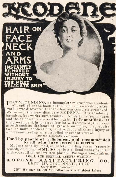 This is an original 1907 black and white print ad for Modene --a hair remover from the Modene Manufacturing Co., Cincinnati, Ohio.