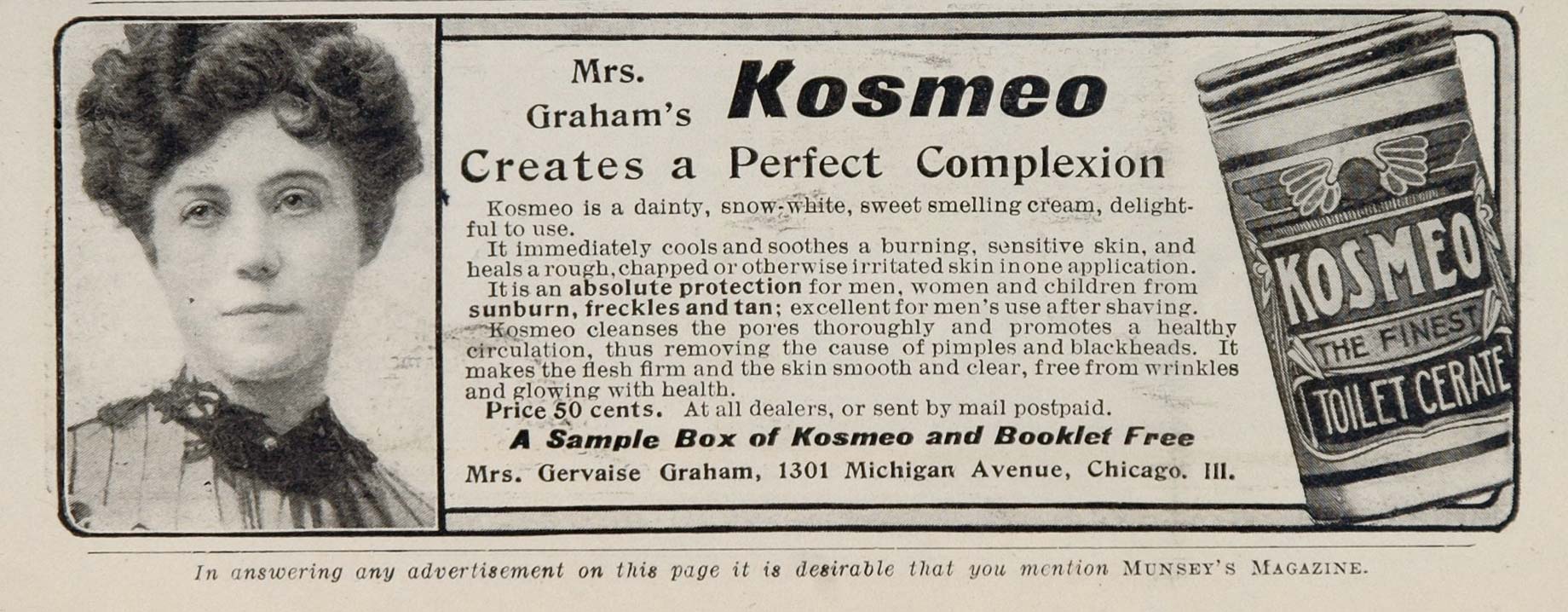 This is an original 1907 black and white print ad for Mrs. Graham's Kosmeo Toilet Cream for sunburn, freckles, and tan, from Mrs. Gervaise Graham, 1301 Michigan Avenue, Chicago.