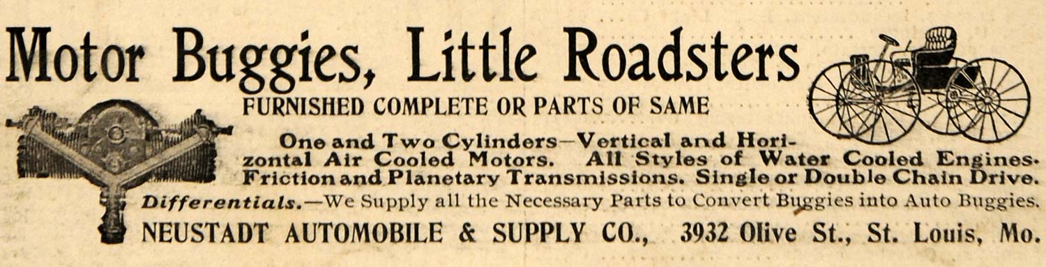 This is a tiny original 1907 black and white print ad for the Neustadt Automobile & Supply Company located at 3932 Olive Street, Saint Louis, Missouri.