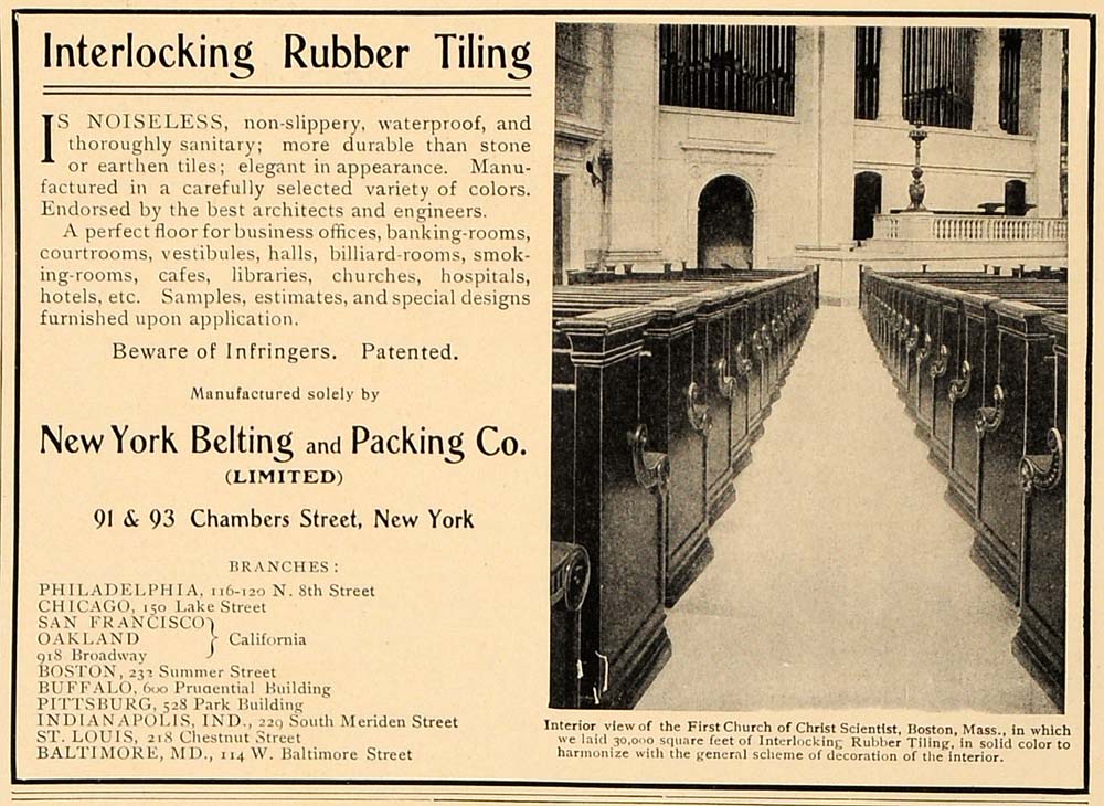 This is an original 1907 black and white print ad for the New York Belting and Packing Company. The ad features an image of the First Church of Christ Scientist in Boston, Massachusetts.