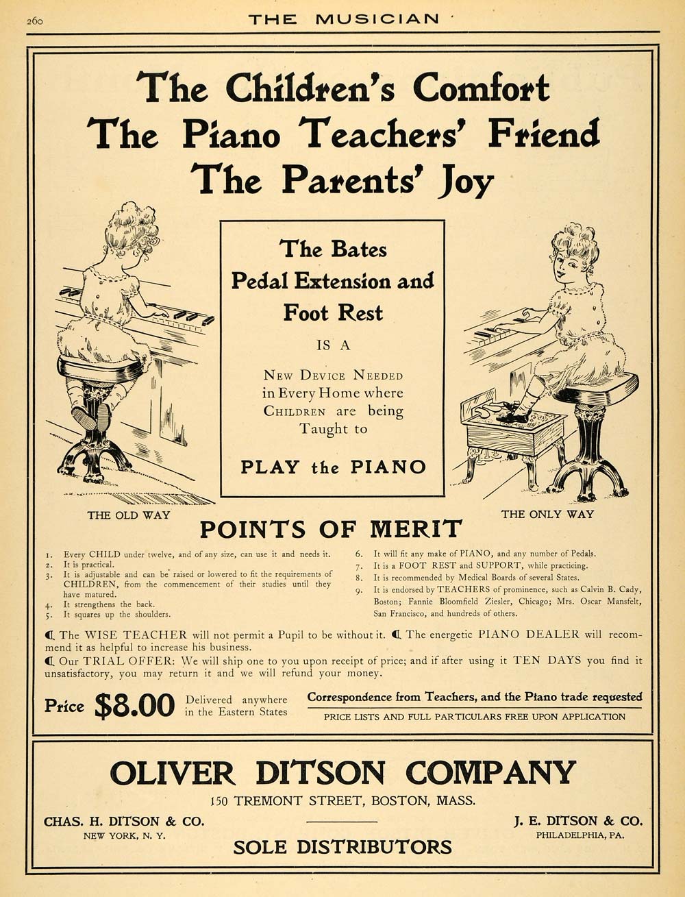 This is an original 1907 black and white print ad for the Oliver Ditson Company of 150 Tremont Street in Boston, Chas. H. Ditson & Company of New York, and J. E. Ditson & Company of Philadelphia. This ad features their children's piano pedal extension and foot rest for young pianists.