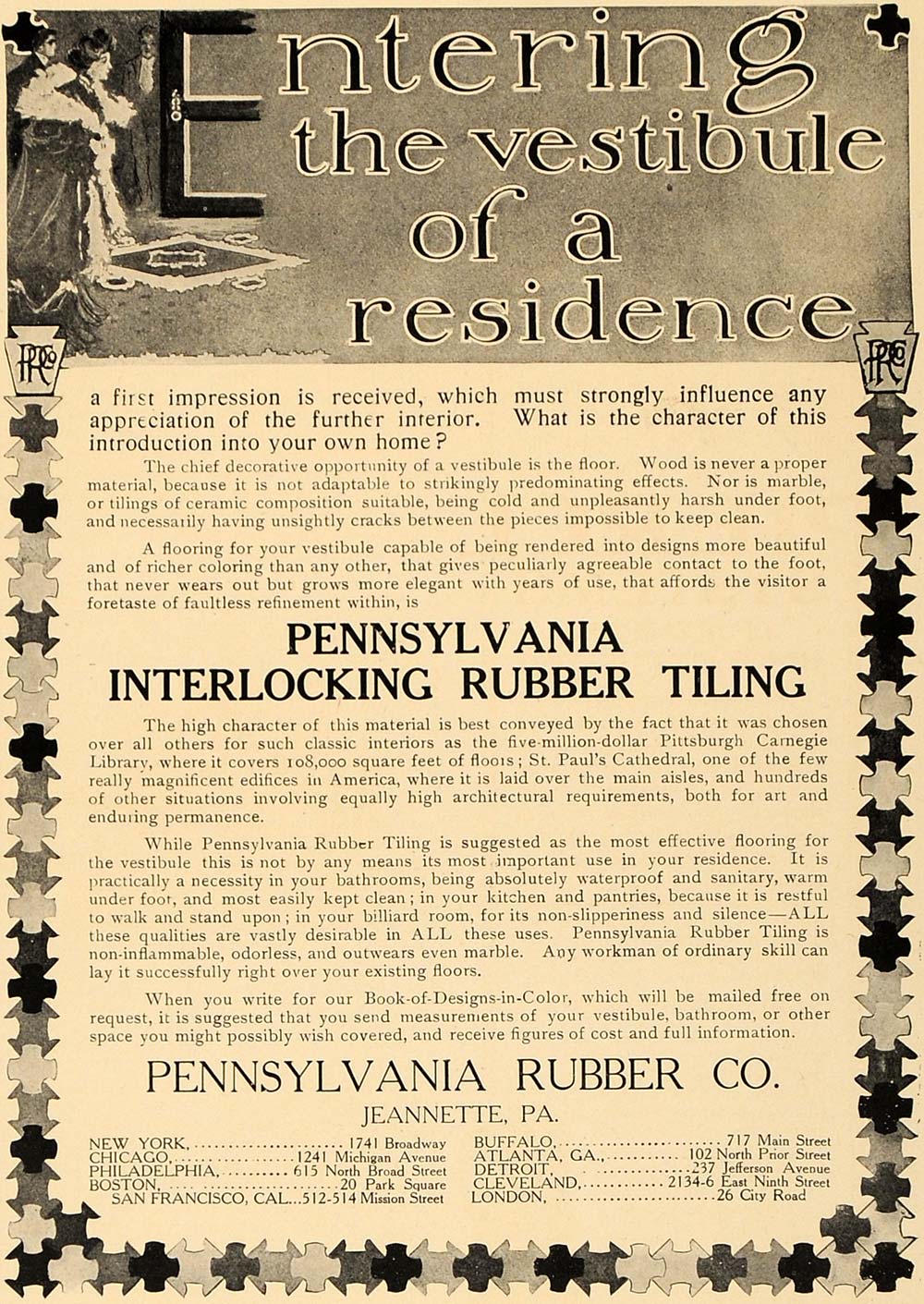 This is an original 1907 black and white print ad for Pennsylvania Interlocking Rubber Tiling, a product of Pennsylvania Rubber Company in Jeannette, Pennsylvania. This tile was easy to assemble. Today, it is commonly found in weight rooms and ice rinks.