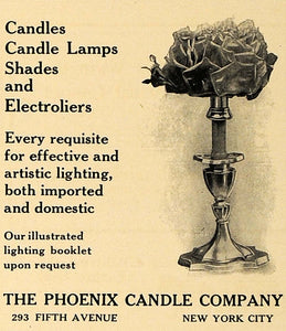 This is an original 1907 black and white print ad for The Phoenix Candle Company, located at 293 Fifth Avenue in New York City.