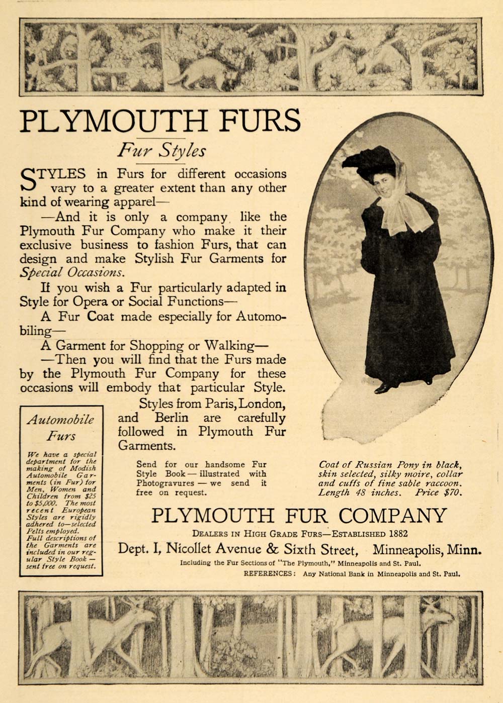 This is an original 1907 black and white print ad for Plymouth Furs by the Plymouth Fur Company located at Nicollet Avenue & Sixth Street, Minneapolis, Minnesota. They were established 1882.