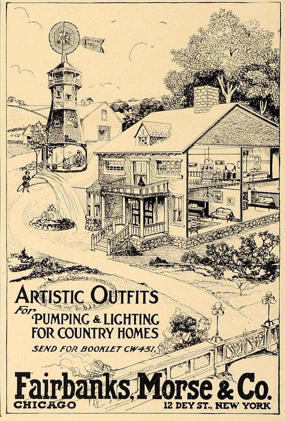 This is an original 1907 black and white print ad for Pumping and Lighting for Country Homes from the Fairbank, Morse, and Co. located in Chicago, Illinois. This is a beautiful illustration of how much is effected by Pumping and Lighting.