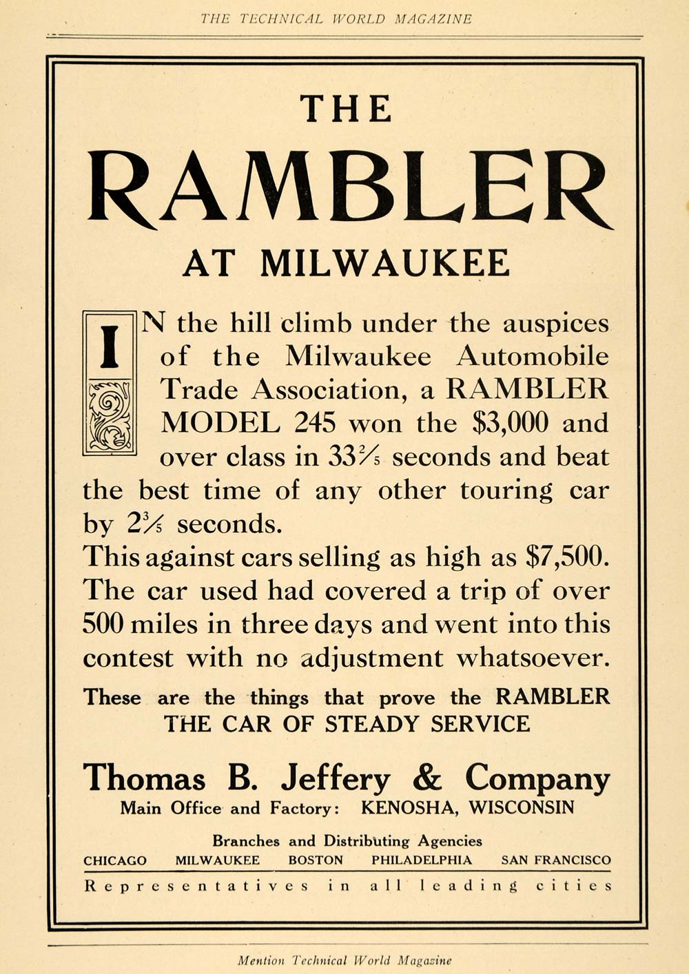 This is an original 1907 black and white print ad for the Rambler from Thomas B. Jeffery and Company of Kenosha, Wisconsin. The ad writes, "In the hill climb under the auspices of the Milwaukee Automobile Trade Association, a Rambler Model 245 won the $3,000 and over class in 33 2/5 seconds and beat the best time of any other touring car by 2 3/5 seconds".