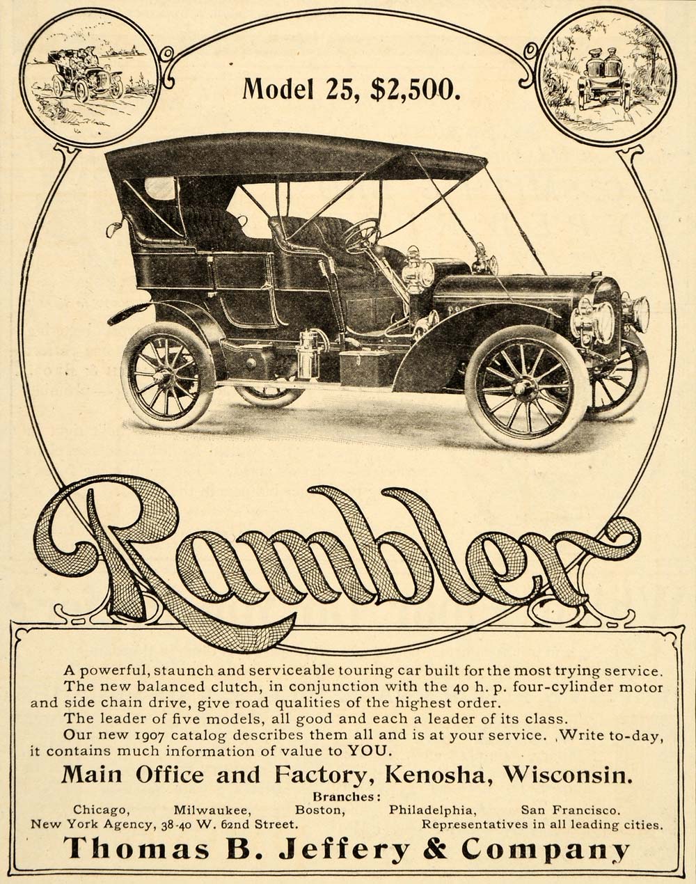 This is an original 1907 black and white print ad for the Model 25 Rambler by Thomas B. Jeffery and Company located in Kenosha, Wisconsin. Their New York agency is located at 38-40 West 62nd Street, New York City, New York. There are branches in Chicago, Milwaukee, Boston, Philadelphia and San Francisco.