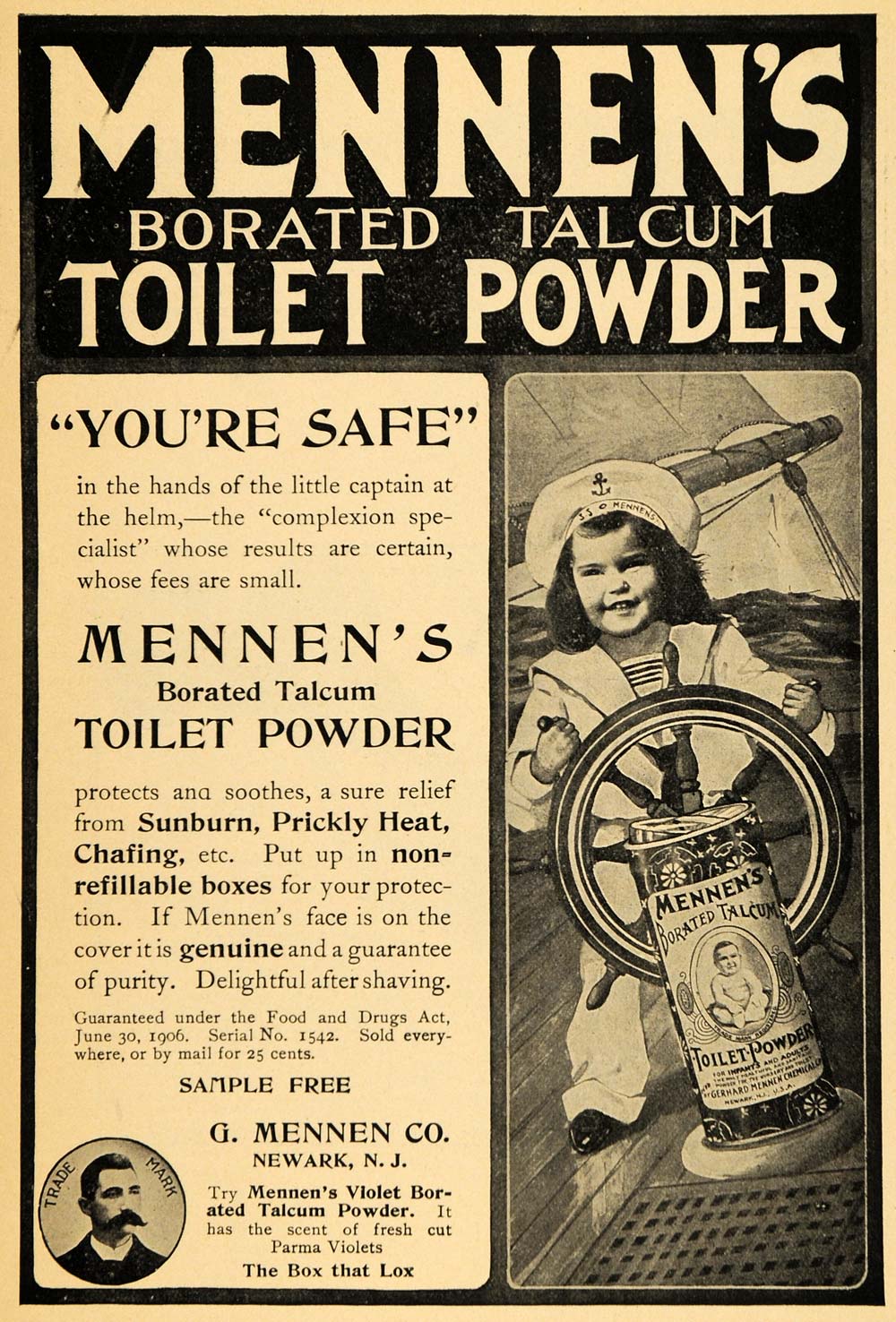 This is an original 1907 black and white print ad for Mennen's Borated Talcum Toilet Powder, relief from sunburn, prickly heat, chafing, etc., by the G. Mennen Company of Newark, New Jersey.