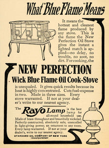 This is an original 1907 black and white print ad for the New Perfection Wick Blue Flame Oil Cook-Stove and the Rayo Lamp, products by the Standard Oil Company of New York.