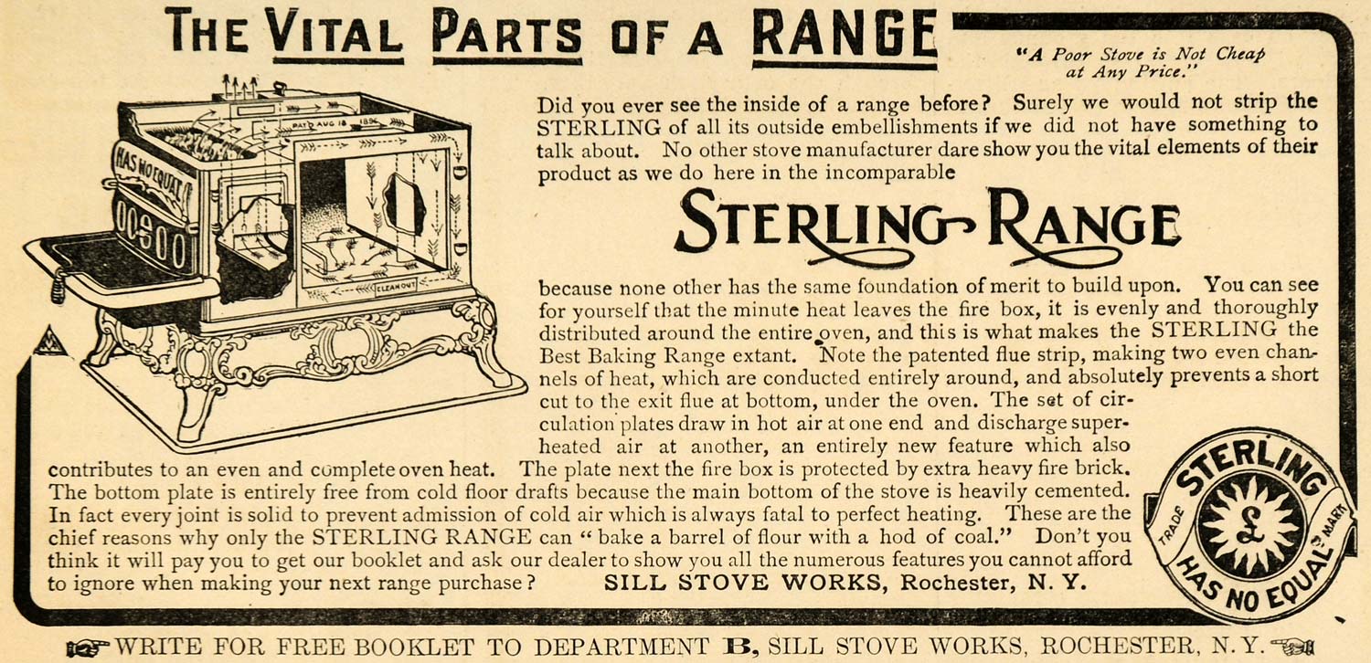 This is an original 1907 black and white print ad for the Sterling Range, a product by Still Stove Works in Rochester, New York.