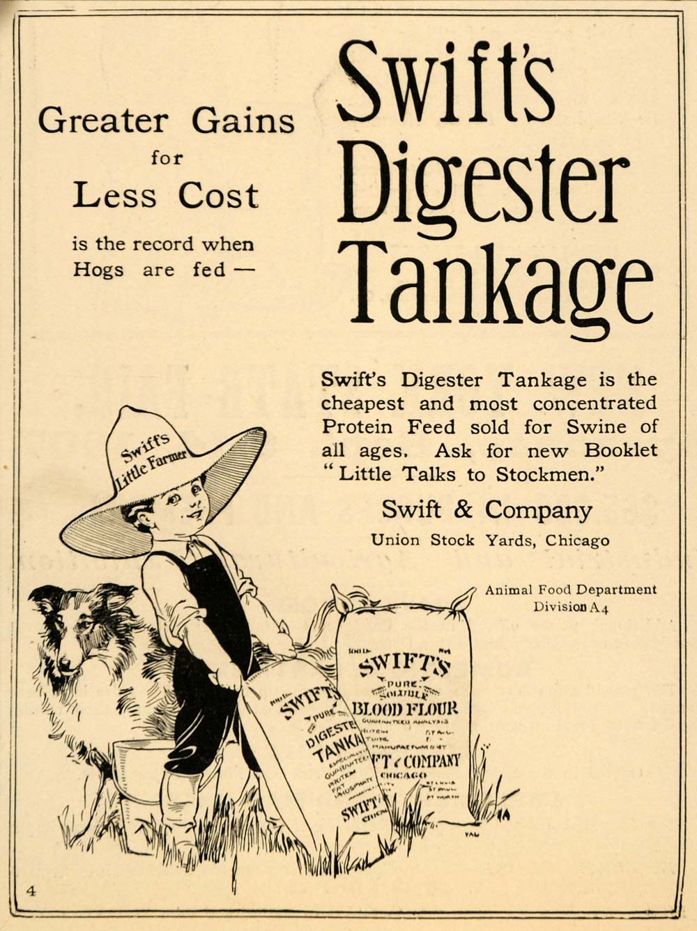 Keywords specific to this image: Blood Flower, Union Stock Yards Chicago, Swift's Little Farmer, Collie, Farming Boy, Grain, Agricultural, Agriculture Vintage Advertising