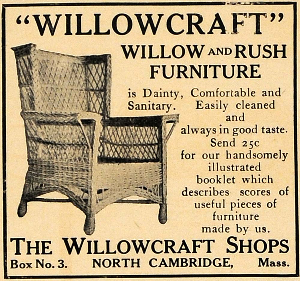 This is an original 1907 black and white print ad for "Willowcraft" willow and rush furniture by The Willowcraft Shops located at North Cambridge, Massachusetts.