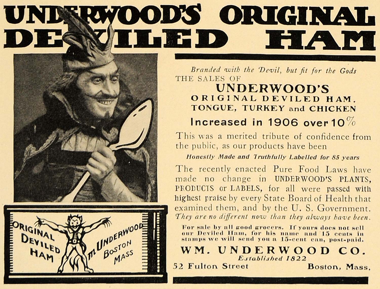 This is an original 1907 black and white print ad for Underwood's Original Deviled Ham, Tongue, Turkey and Chicken. Founded by William Underwood in 1822, in Boston, Massachusetts, the company began glass packaging condiments such as ketchup, mustard, cranberries and more; however, the company changed packaging from glass to steel cans with tin coated interiors due to the Boston-area glassmakers inability to match the cannery's demand. Underwood's canned products were dolled out to the American Civil War troops during the years of 1861 to 1865. In 1868, the brand's red devil logo was created. Today, it is the oldest trademark still in use in the United States. It is estimated that additional meats and seafood were canned by the company during the WWI essential meats conservation movement; thus inspiring the featured canned meat spread.