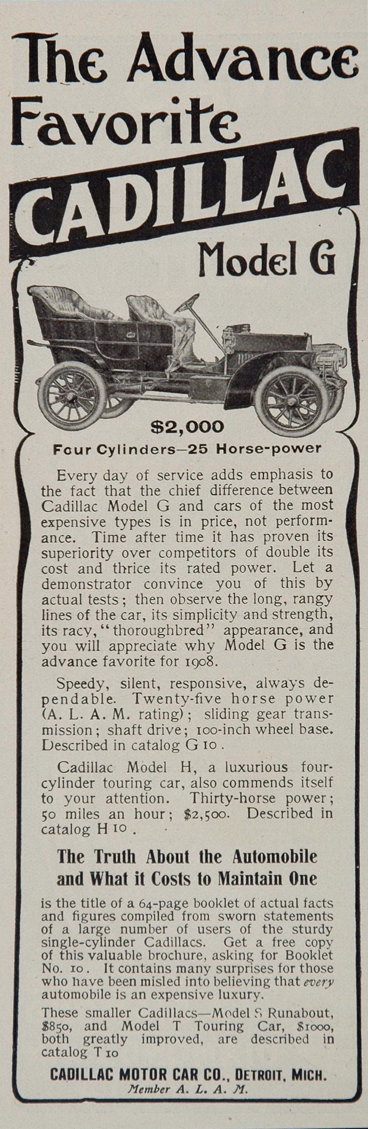 This is an original 1907 black and white print ad for the Cadillac Model G automobile with four cylinders, 25 horse-power ($2000). Made by the Cadillac Motor Car Company of Detroit, Michigan.