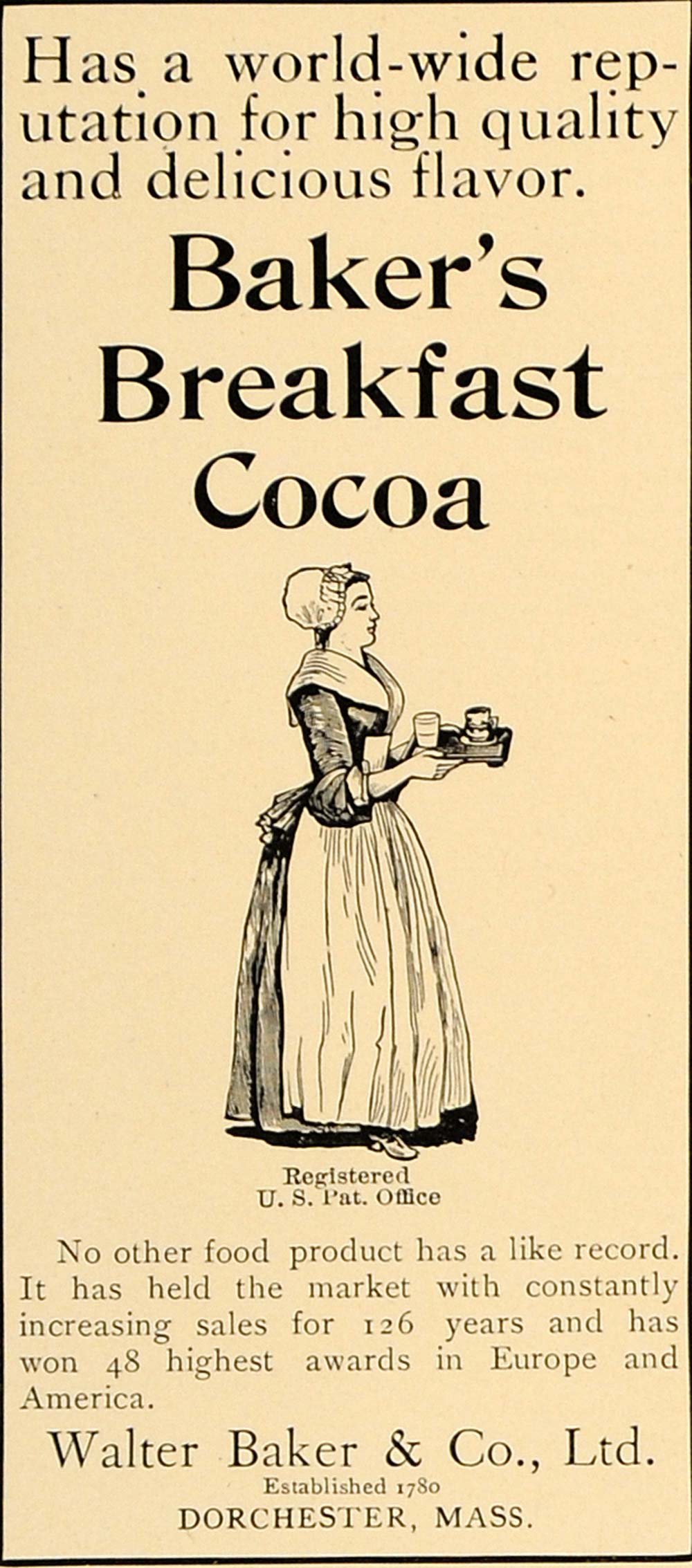 During the 1840s, the BakerÕs brand was being shipped via train to Nova Scotia, Portland, Maine, Halifax, Philadelphia, Virginia, Georgia, Baltimore, New Orleans and San Francisco (just in time for the hugely popular California Gold Rush). Walter was determined to make the family business a huge success by striving for superior product quality, unparalleled company reputation and strong customer loyalty. He also realized the grave importance of advertising and would correspond regularly with his distributors, retailers and even certain individual customers, as well as keep a personal tab on the various regional advertising campaigns that were in place. A very-involved Walter wanted to remain intimately connected with the companies that sold his product line and would often suggest various marketing ideas, such as window displays and the reuse of the productÕs tins. During this time, Walter expanded his product line to include Spiced Cocoa Sticks, French and Spanish Chocolate, Homeopathic Chocolate and Caracas chocolate.