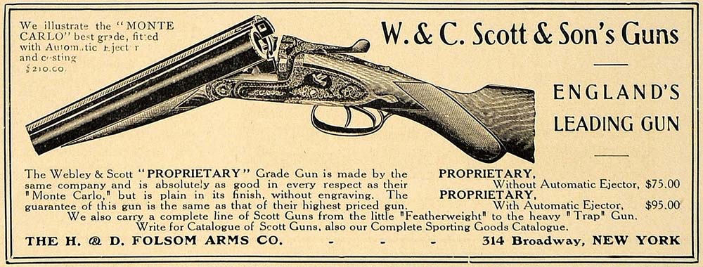 This is an original 1907 black and white print ad for the Monte Carlo and Proprietary W. & C. Scott and Son's Guns by The H. & D. Folsom Arms Company located at 314 Broadway, New York City.