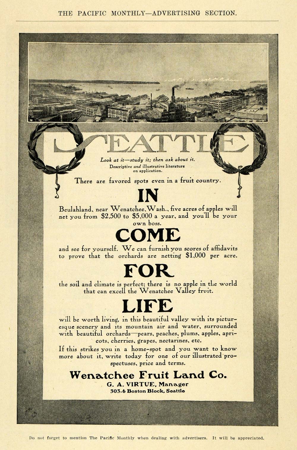 This is an original 1907 black and white print ad for land in the Wenatchee Valley of Washington from Wenatchee Fruit Land Company, G. A. Virtue, Manager, 303-6 Boston Block, Seattle.