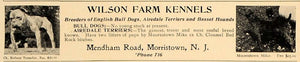 This is an original 1907 black and white print ad for Wilson Farm Kennels, breeders of English Bull Dogs, Airedale Terriers and Basset Hounds. This farm was located on Mendham Road in Morristown, New Jersey.