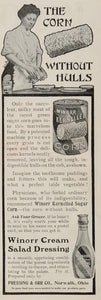 This is an original 1907 black and white print ad for Winorr Kernelled Sugar Corn and Winorr Cream Salad Dressing from the Pressing & Orr Co., Norwalk Ohio.