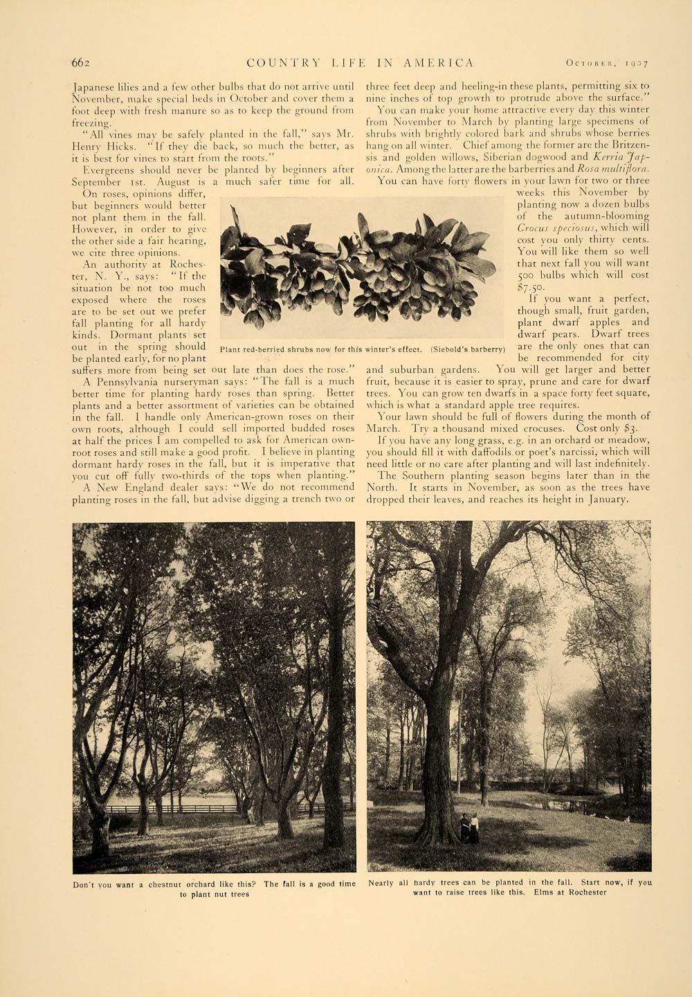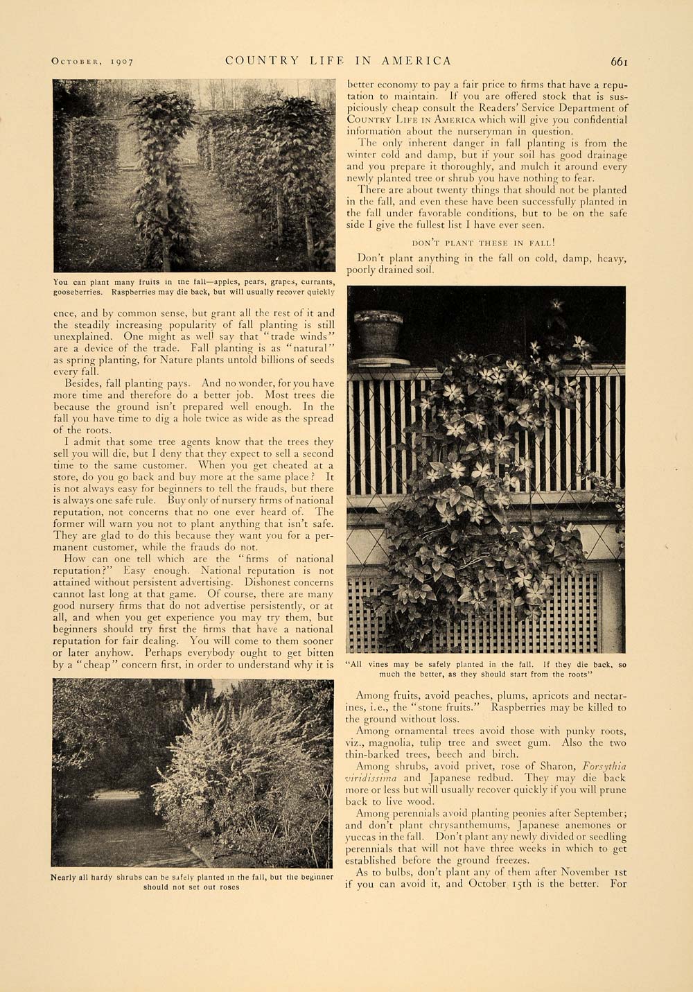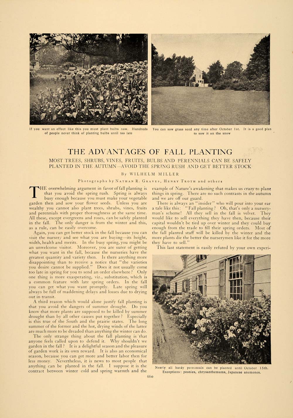 This is an original 1907 3-page article (two pages, one being double-sided) by Wilhelm Miller on the advantages of fall gardening and planting. Photography by Nathan R. Graves, Henry Troth and others. Please see additional images.