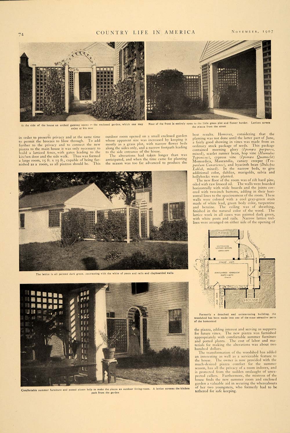 This is an original 1907 2-page article (one double-sided page) by H. W. Gardner on how an old farm woodshed was transformed from an eyesore into a beautiful piazza. Please see additional image.