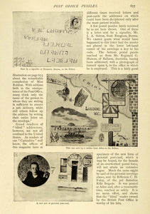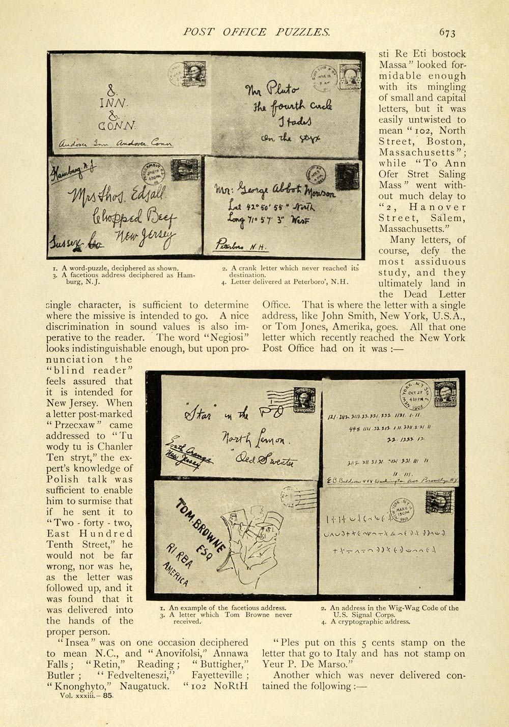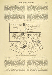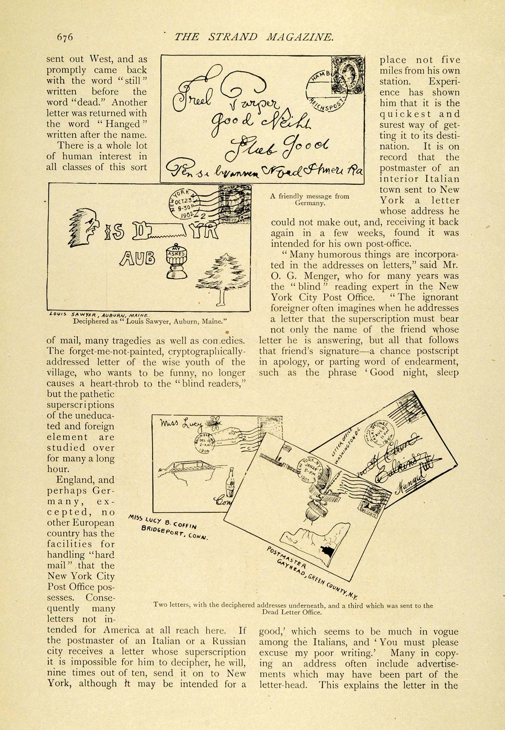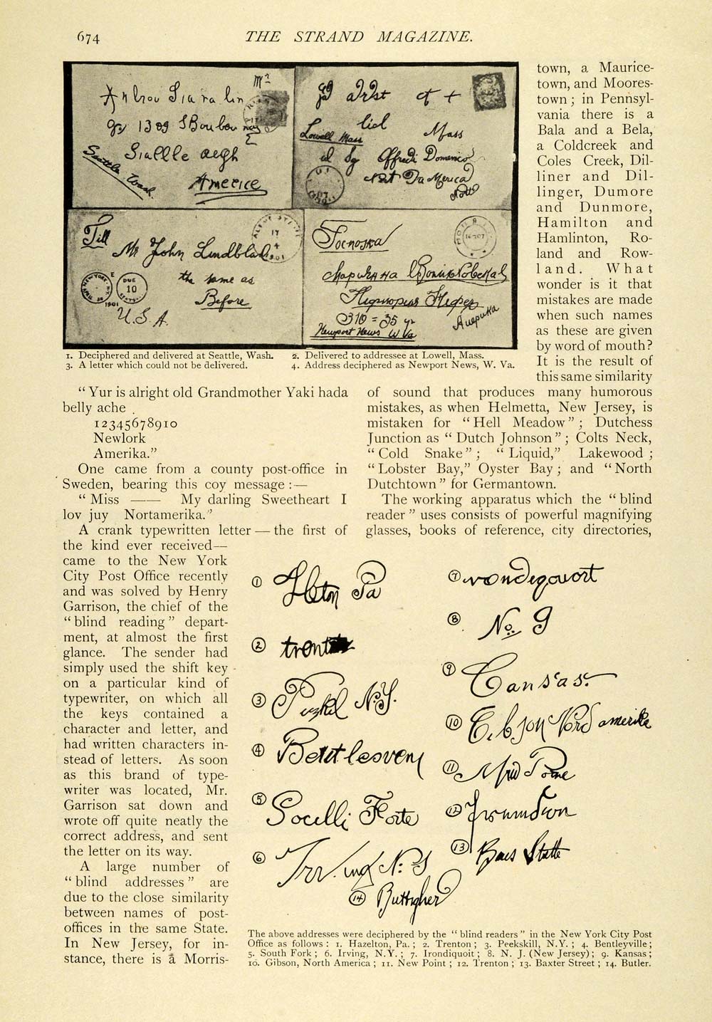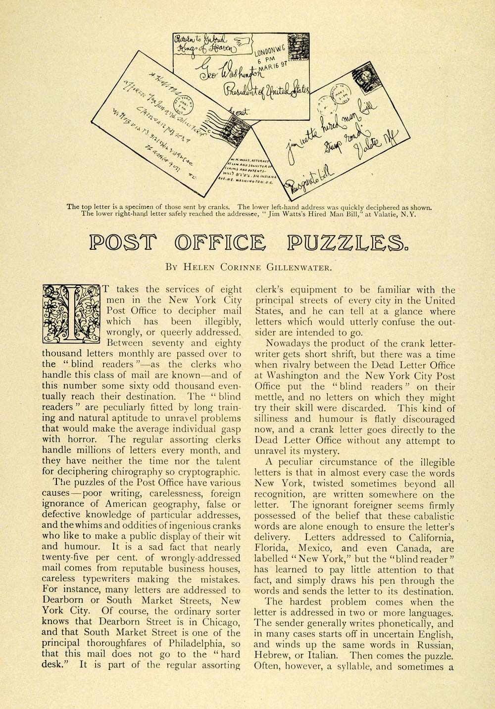 This is an original 1907 6 page article (four pages, two being double-sided) by Helen Corinne Gillenwater on the difficulties in deciphering illegibility, foreign languages and other "code" mailing addresses. An amusing fact about this article is that the author is almost outraged at the fact that it takes EIGHT men to identify all of the skewed addresses that come through NEW YORK CITY. I cannot imagine how many it takes today!!! It is also interesting to see the various letters that came through the Postal system during this time period, and what people must have thought America was like. Please see additional images.