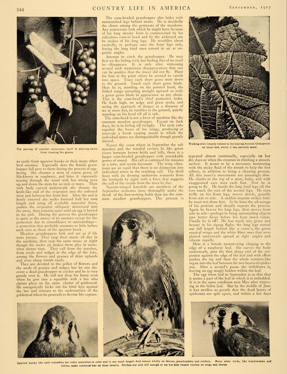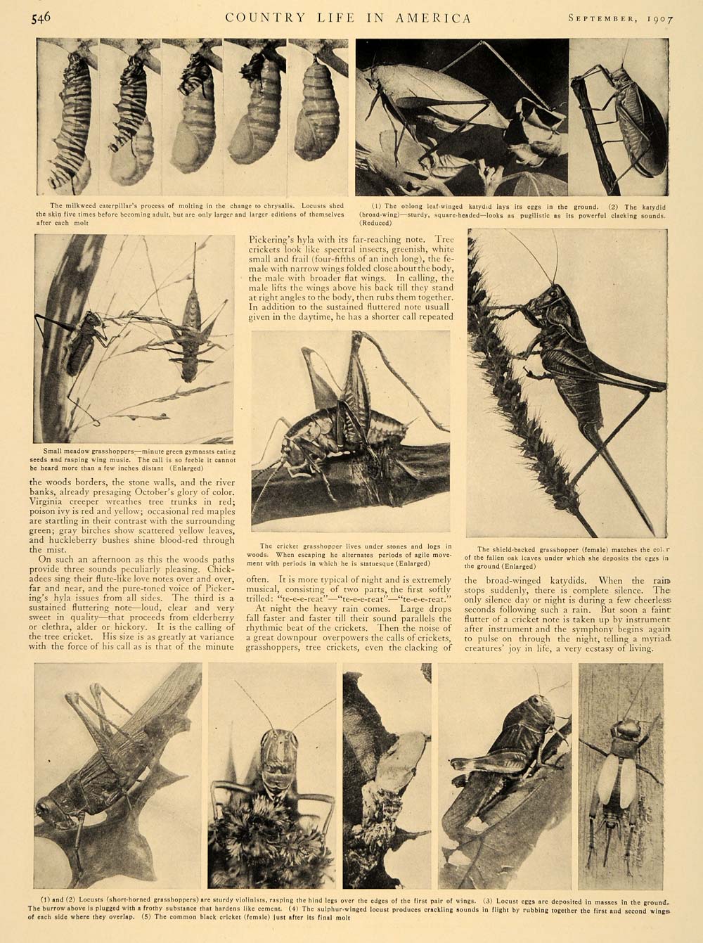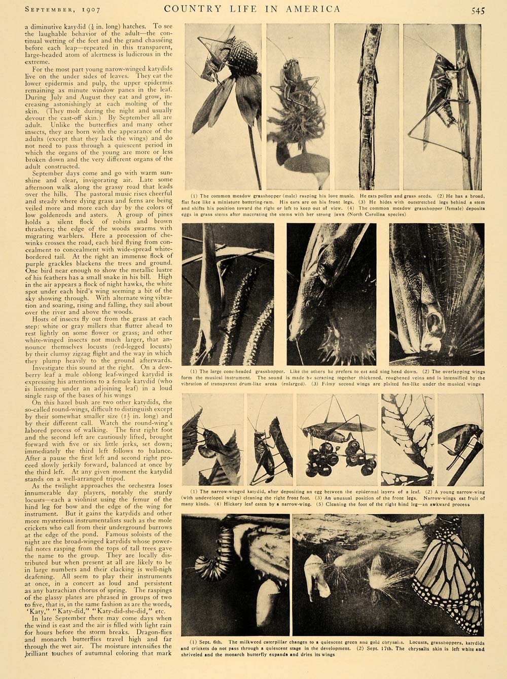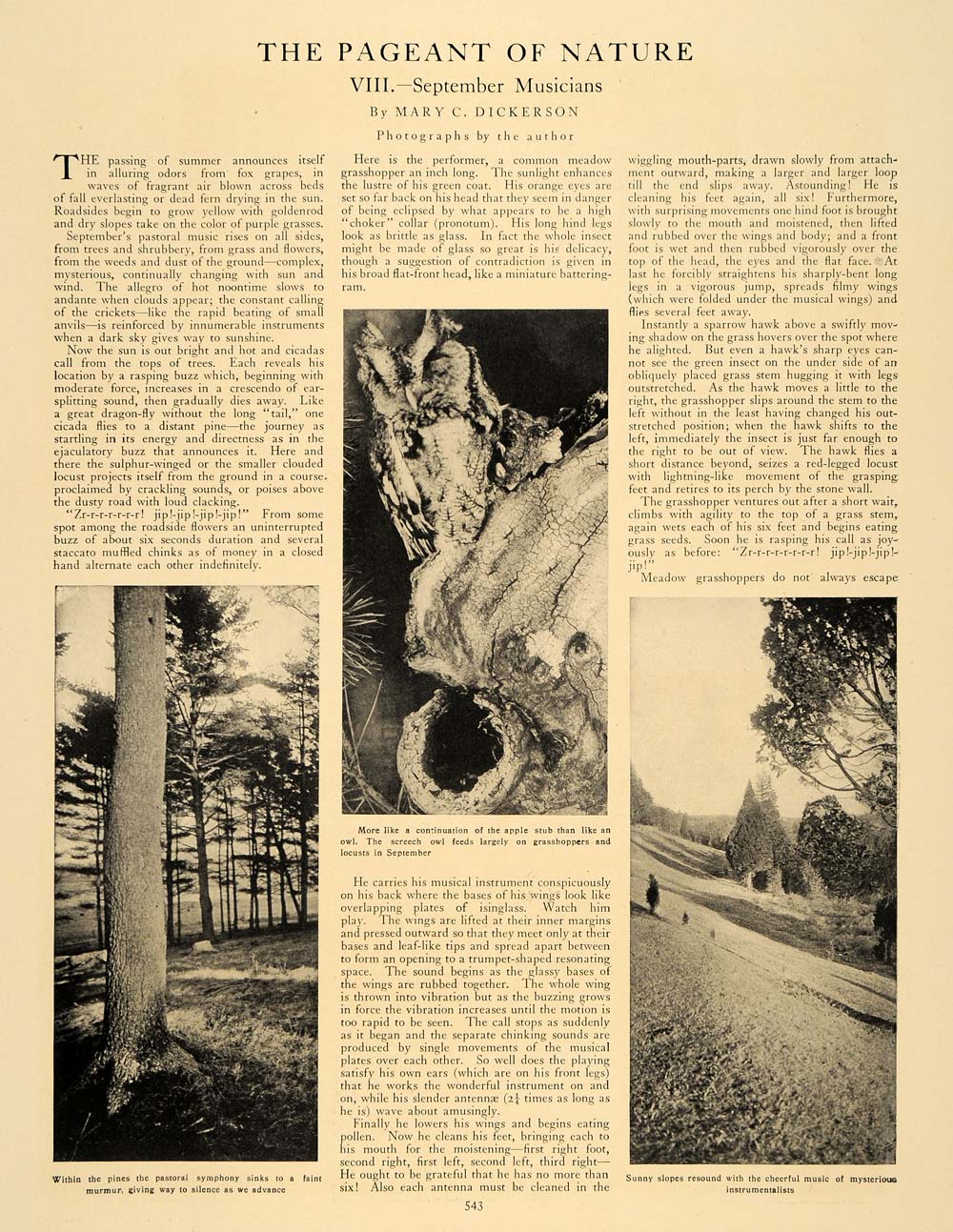 This is an original 1907 4-page article (two double-sided pages) by Mary C. Dickerson on the smaller life forms found in nature, including the Monarch Butterfly, the Screech Owl, the Sparrow Hawk, Locusts, Grasshoppers and more. Please see additional images.