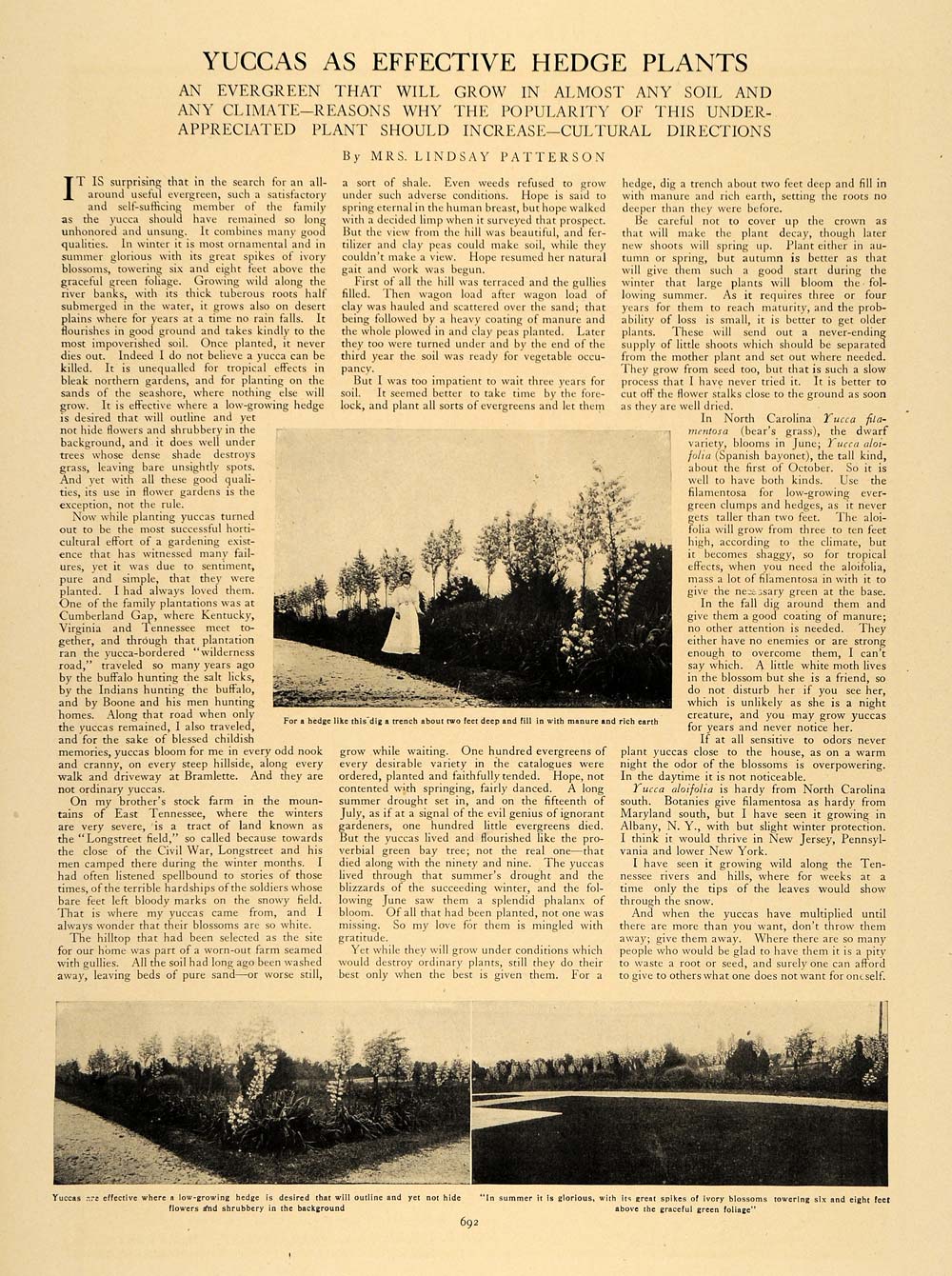 This is an original 1907 1 page article by Mrs. Lindsay Patterson on utilizing Yuccas as hedge plant decor.