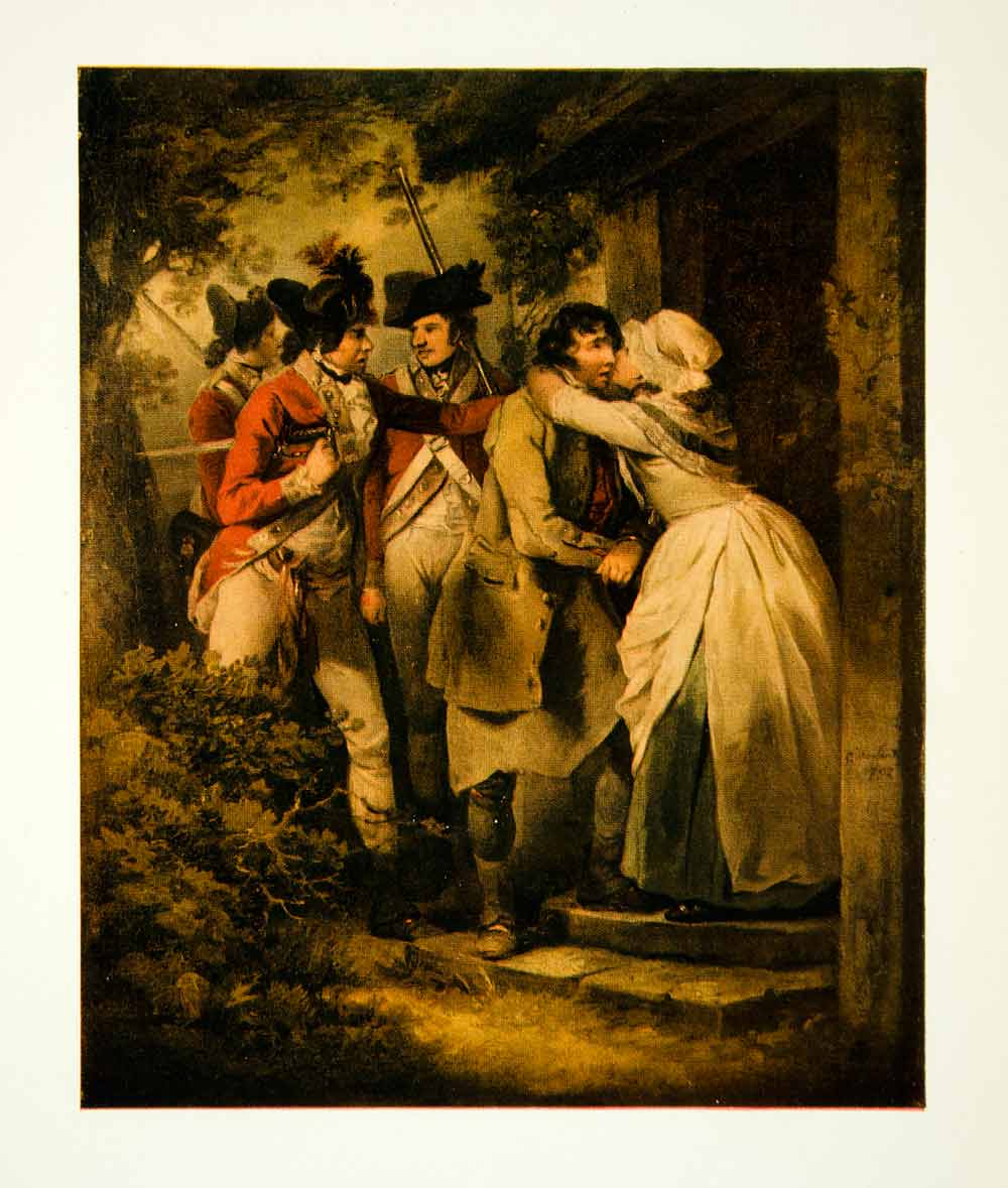 This is an original 1907 color print of a painting by George Morland that portrays a deserter in the British army being brought back for court martial.