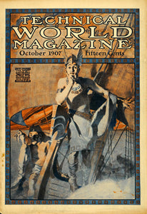 This is an original 1907 color cover for for the October issue of Technical World Magazine, featuring an image of Hermes, the Greek god of travelers and invention. The winged hat signifies him as well as the winged shoes, the tortoise, and the rooster. Written next to him is, "The Spirit of Discovery". Based upon what can be seen of the signature, we believe the artist of the cover to be W. D. Goldbeck.CONDITION