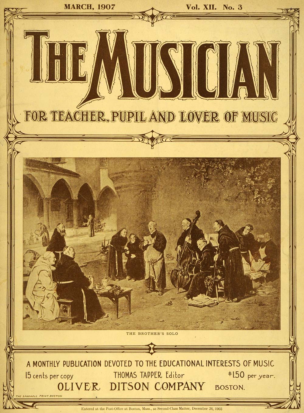 This is an original 1907 color cover for The Musician Magazine for March (Volume XII, No. 3) from the Oliver Ditson Company of 150 Tremont Street in Boston, Massachusetts. This magazine's editor is Thomas Tapper, and this cover features an illustration of a band of monks performing a tune.CONDITION