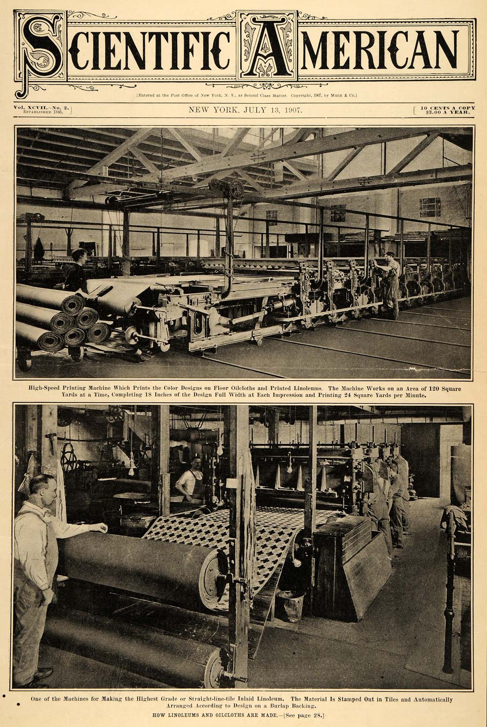 This is an original 1907 black and white cover for The Scientific American Journal for July 13th (Volume XCVII, No. 2) from Munn & Company. This cover features images of a high-speed printing machine for floor oilcloths and linoleum, and a linoleum-making stamping machine.CONDITION
