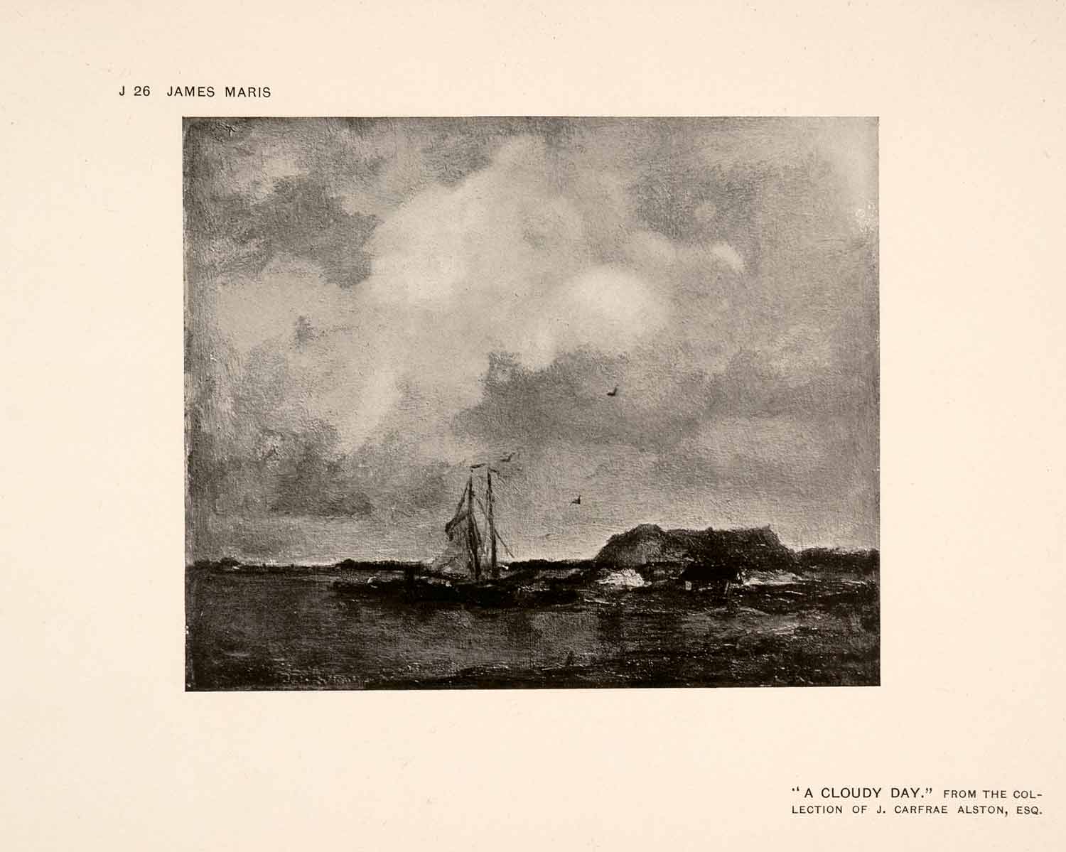 This is an original 1907 black and white halftone print of a Dutch ships sailing near the coast on "A Cloudy Day".