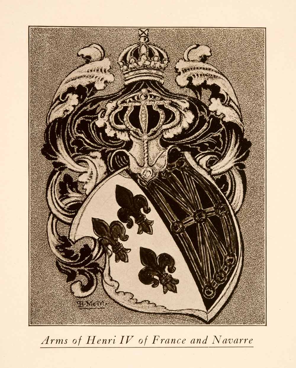 This is an original 1907 black and white halftone print of the Arms of Henri IV of France and Navarre.