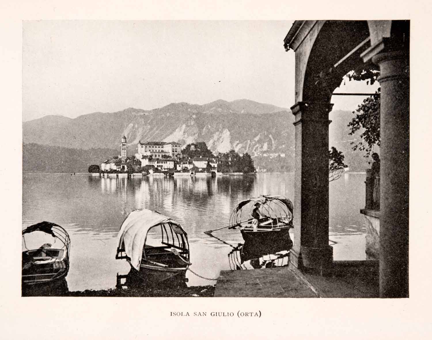 This is an original 1907 black and white halftone print of the Isola San Giulio or San Giulio Island in Italy. On this island lies the Basilica of Saint Giulio as well as the old Seminary.