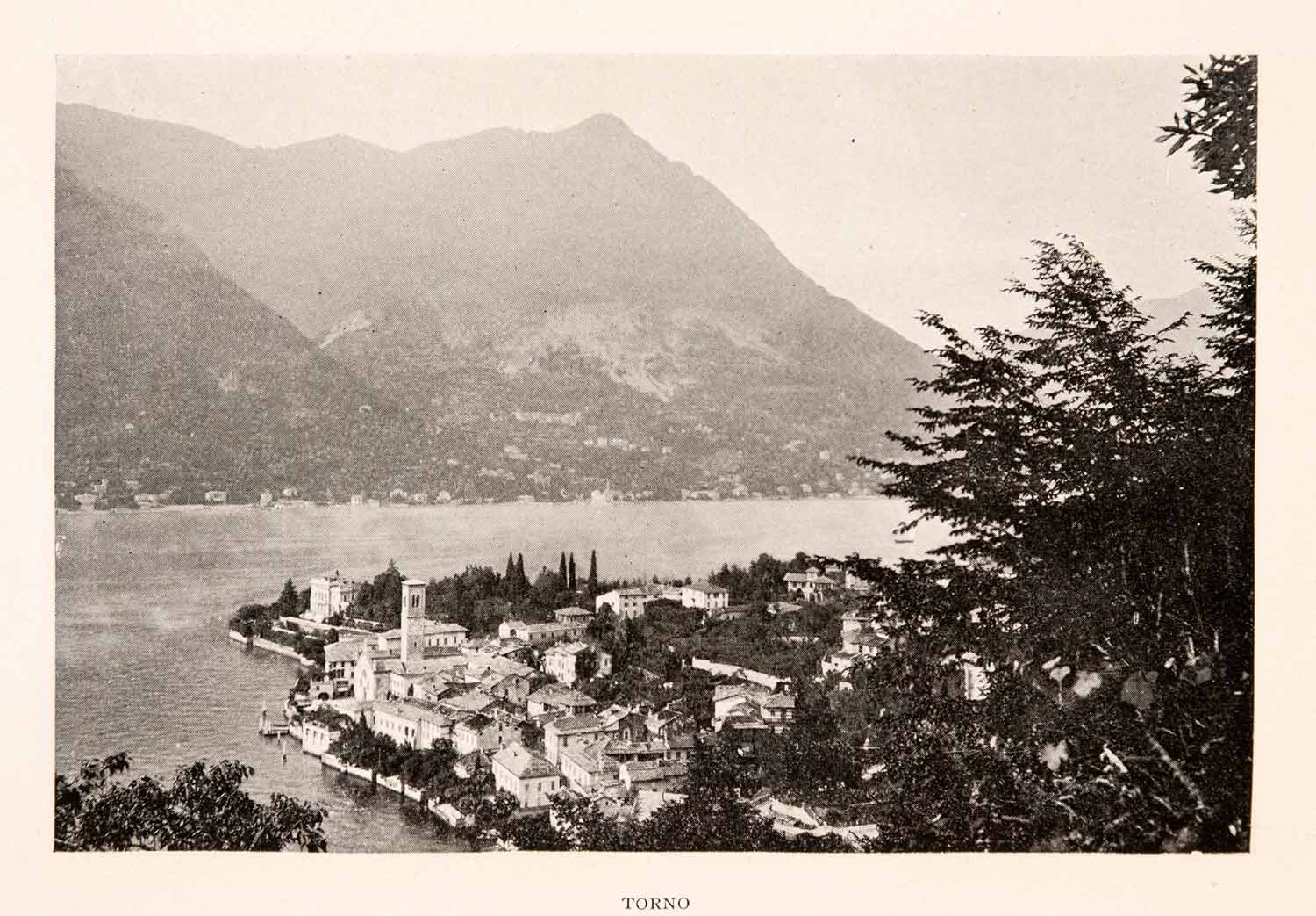 This is an original 1907 black and white halftone print of Torno in Lombardy, Italy. Torno is one of the most picturesque villages on this lake shore.