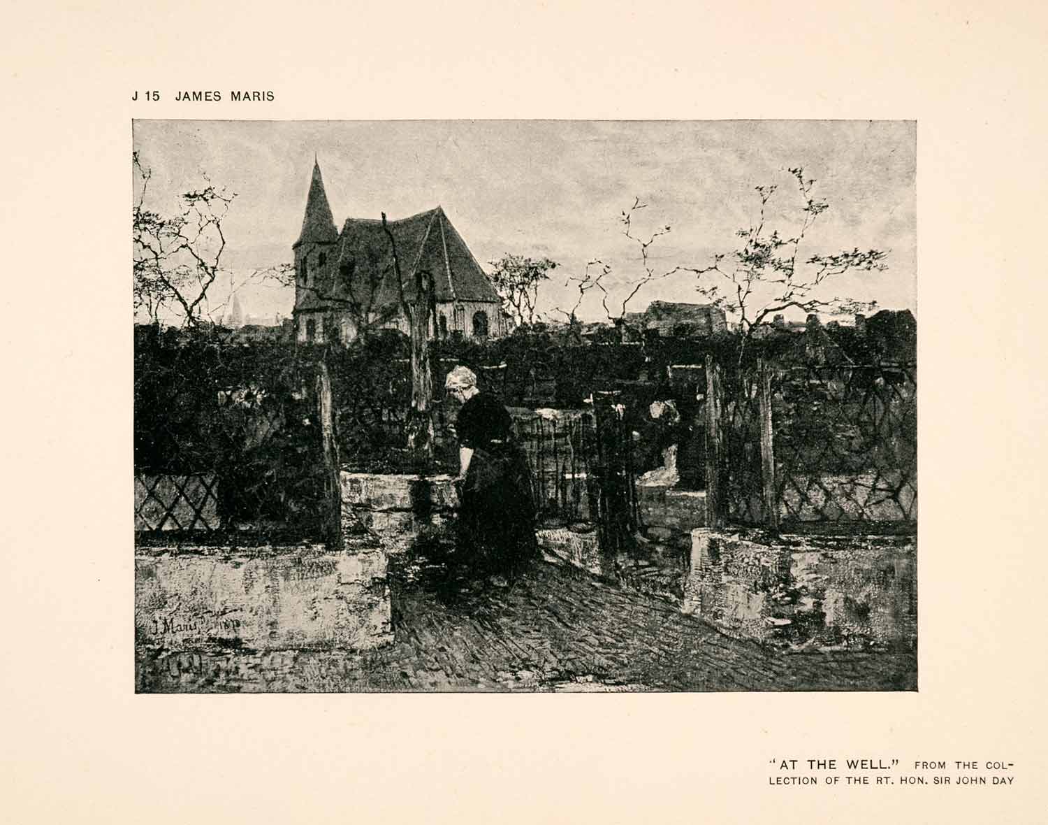 This is an original 1907 black and white halftone print of a Dutch woman drawing water "At The Well".