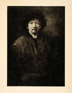 This is an original 1907 black and white photogravure of a self portrait of Rembrandt, himself. Rembrandt was a Dutch painter and etcher. He is considered one of the greatest printmakers in European art history and the most important in Dutch history. His contributions to art came in a period of great wealth and cultural achievement that historians call the Dutch Golden Age.