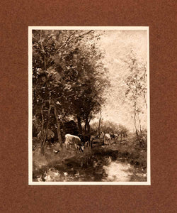 This is an original 1907 black and white tipped-in photogravure of cattle and chickens near a farm stream in "Springtime".