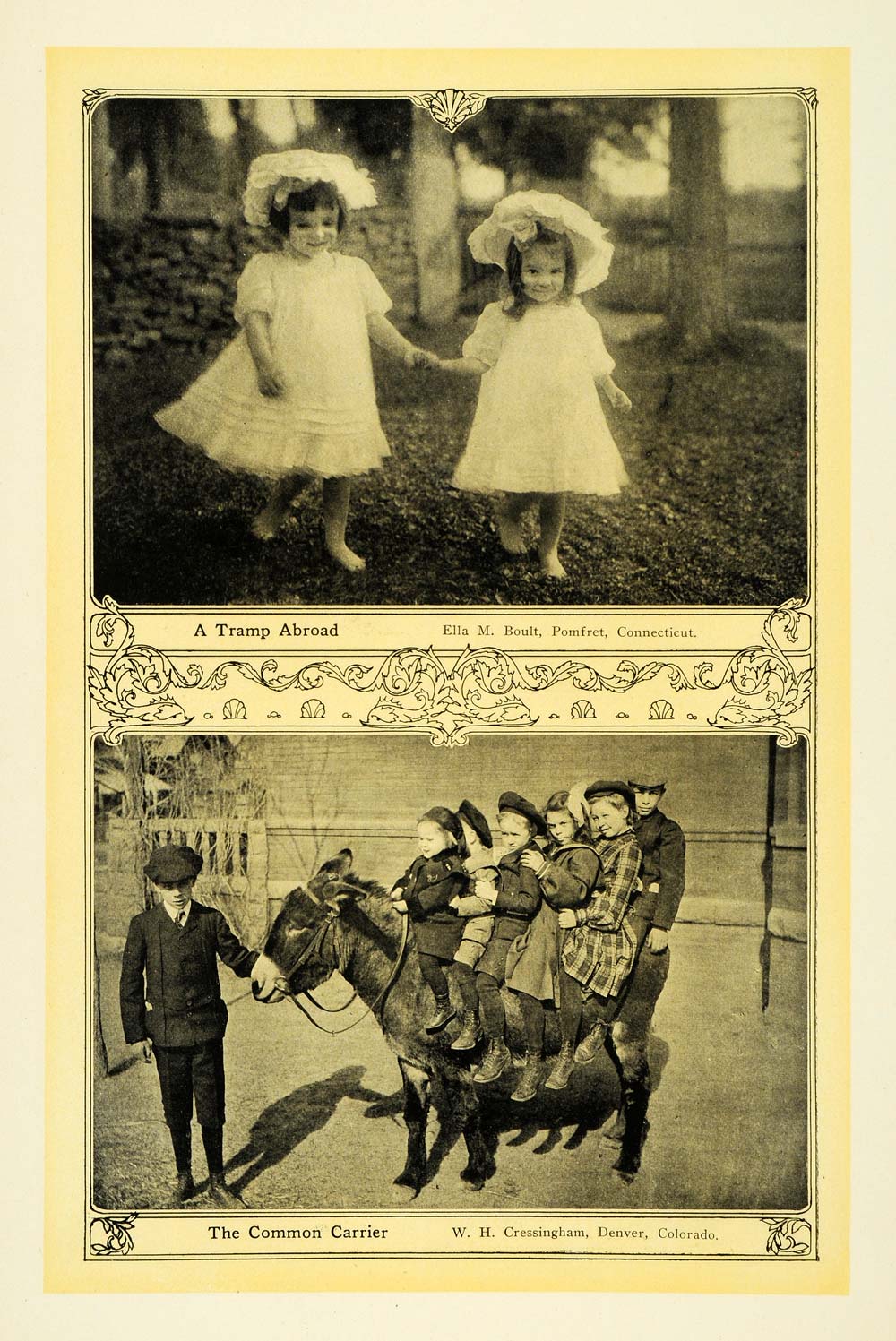 This is an original 1907 color print with two images. The top image is of two adorable children wearing fashion typical of the day near Pomfret, Connecticut. Photograph by Ella M. Boult. The bottom image is of a group of kids sitting in the back of a donkey near Denver, Colorado. Photograph by W. H. Cressingham.