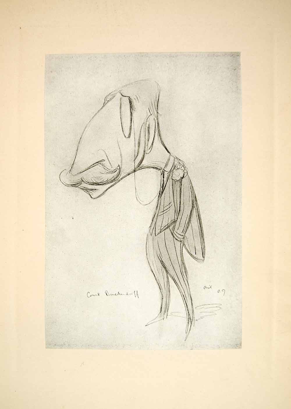 This is an original 1907 tipped-in black and white print by Max Beerbohm of Count Alexander Konstanrinovich Benckendorf, the Russian diplomat, who served as ambassador to Denmark and the United Kingdom.