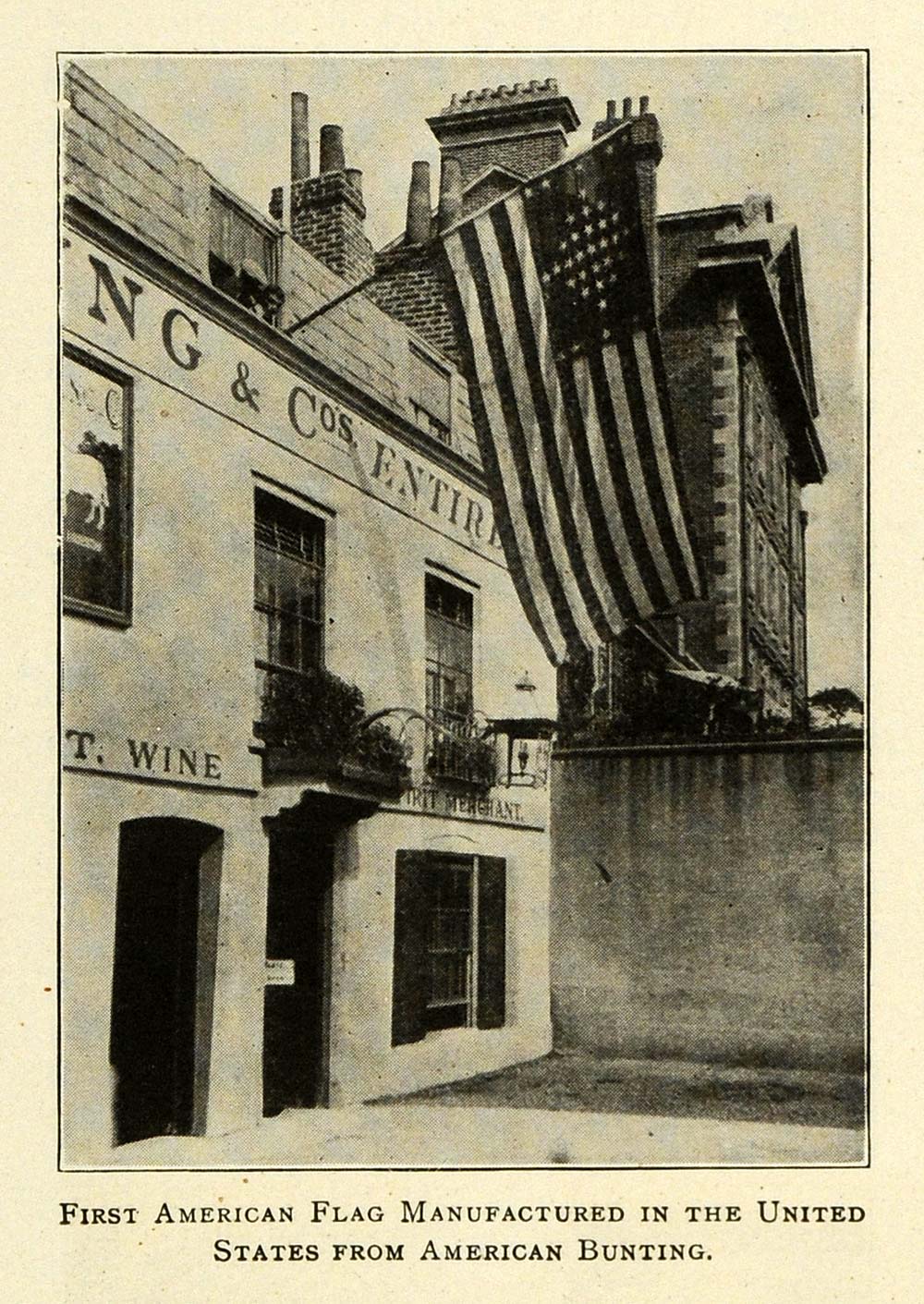 This is an original 1907 halftone print of the first American flag manufactured in the United States. The flag is displayed in Barnes, Egland at the Red Lion Hotel.